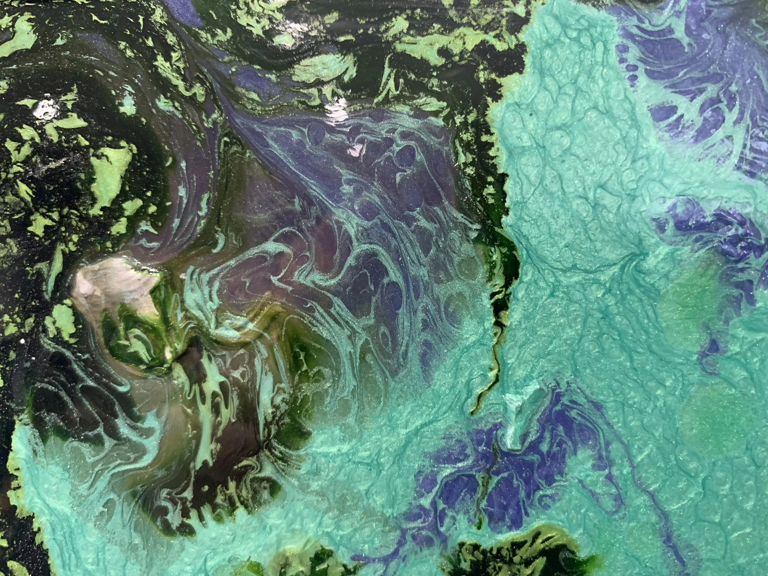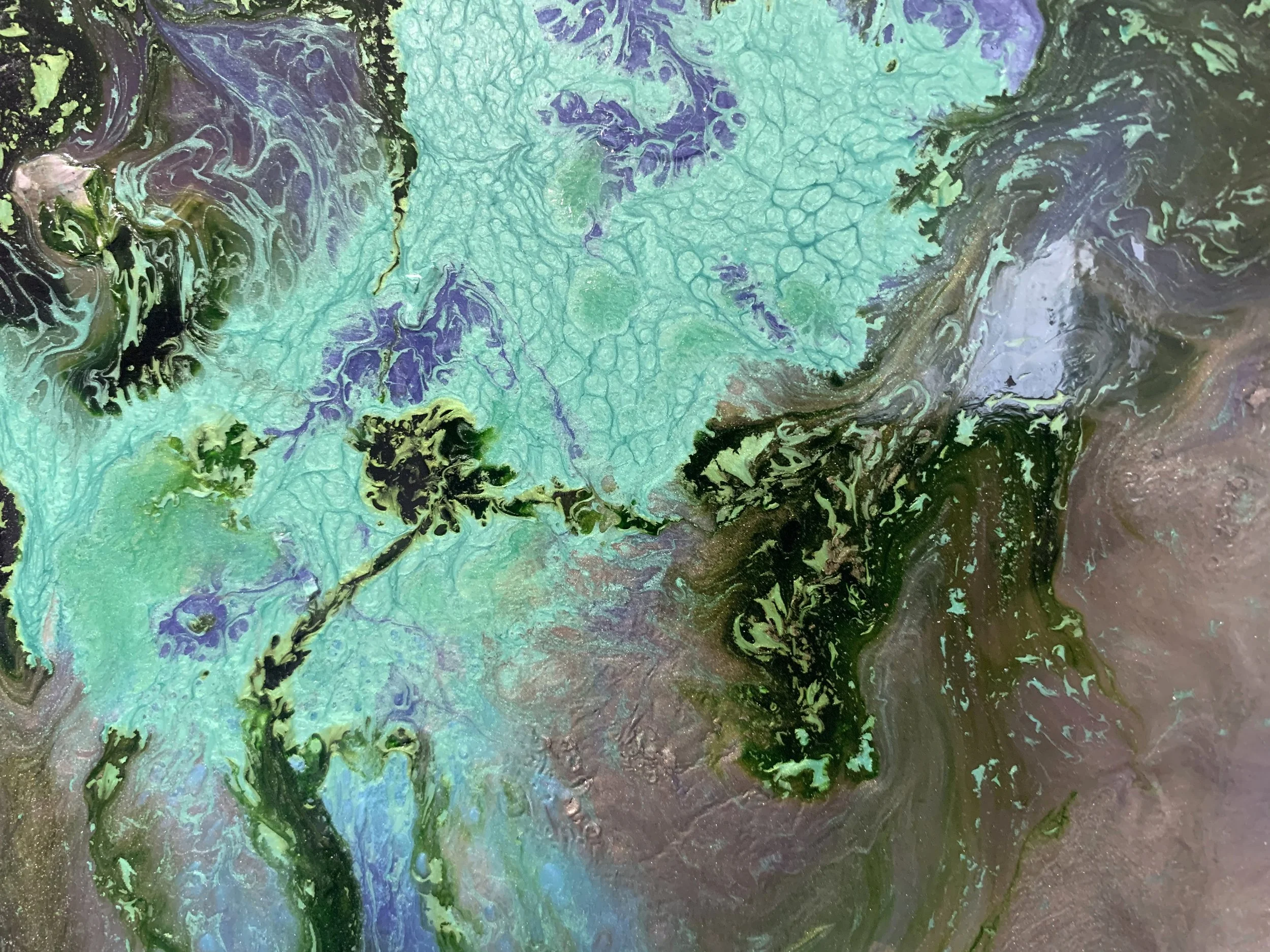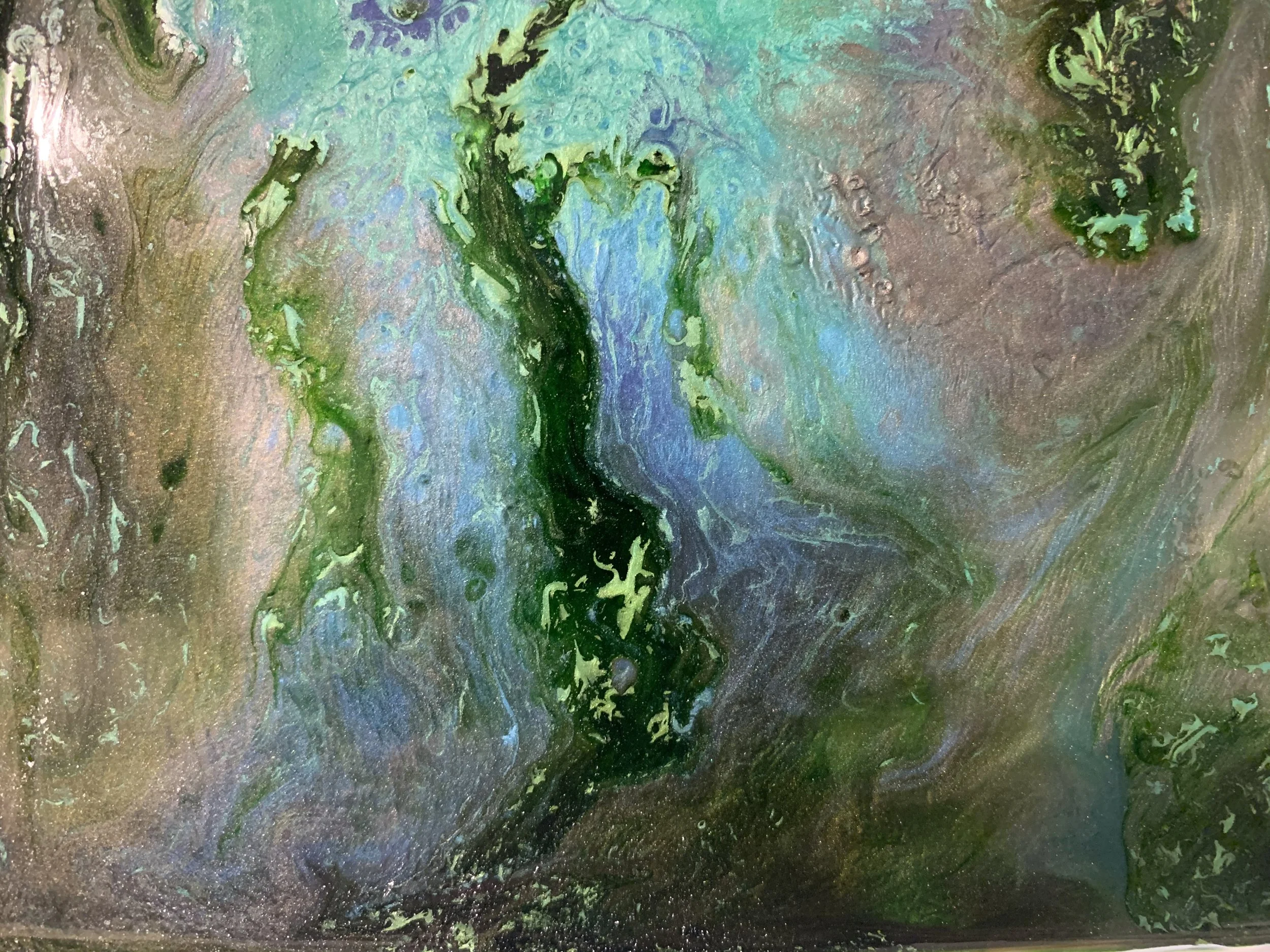 Leviathan and Behemoth are two cupboard doors with pouring paints applied into the inset panel in contrasting colours.