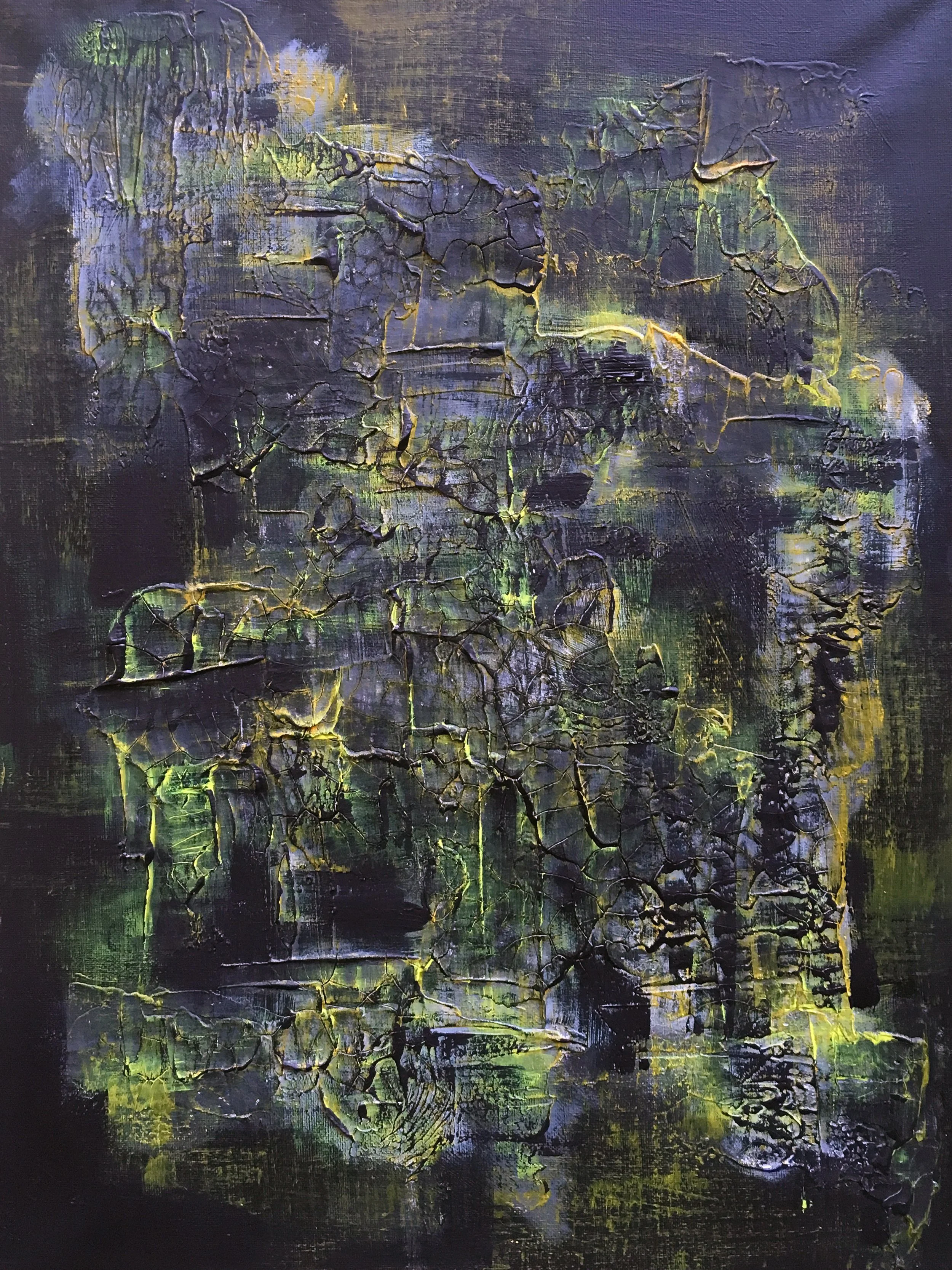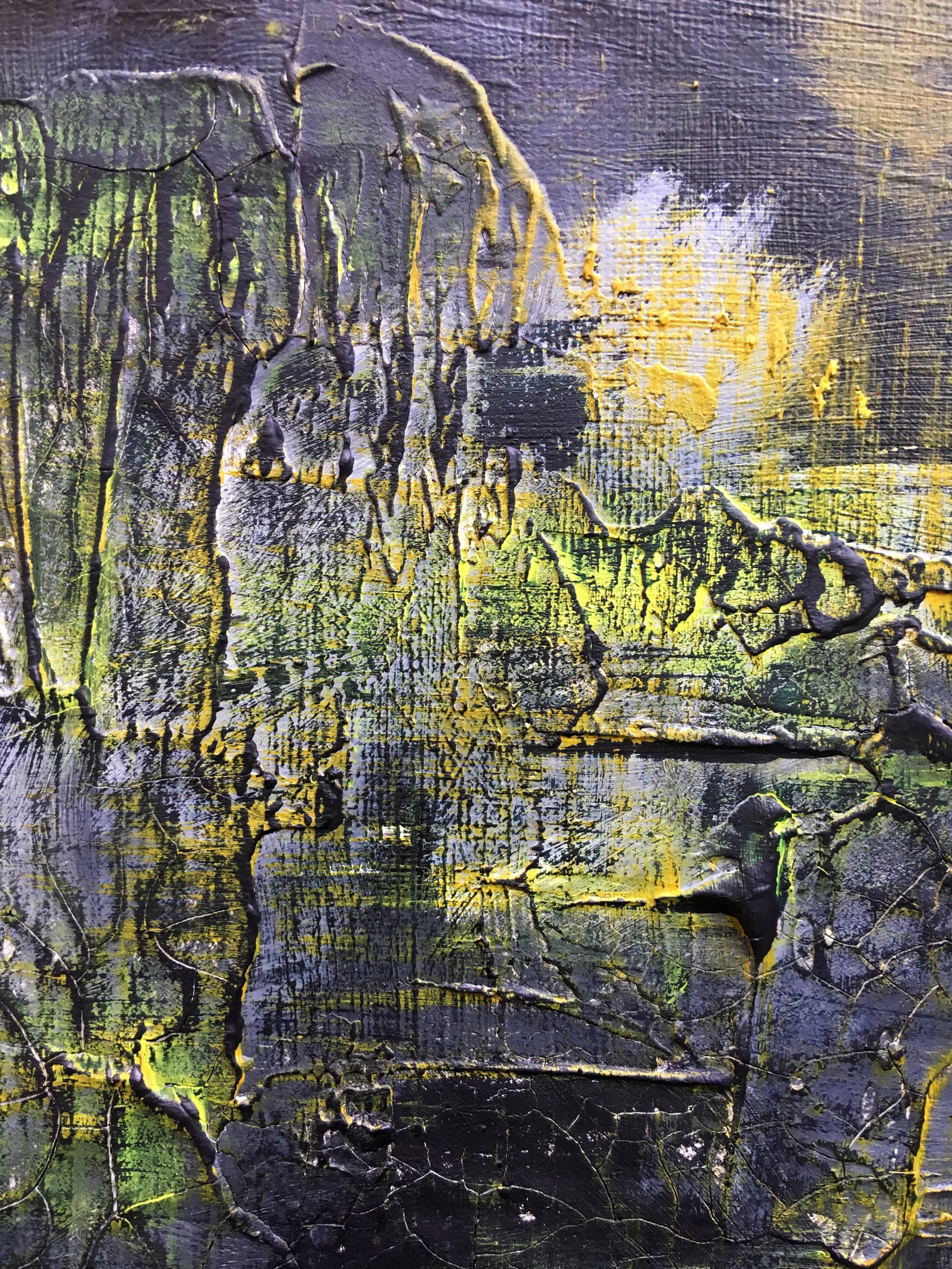 Lightning is a 40cm x 50cm abstract painting that uses black, white, and yellow paint on a cracked clay canvas to create a composition inspired by lightning.
