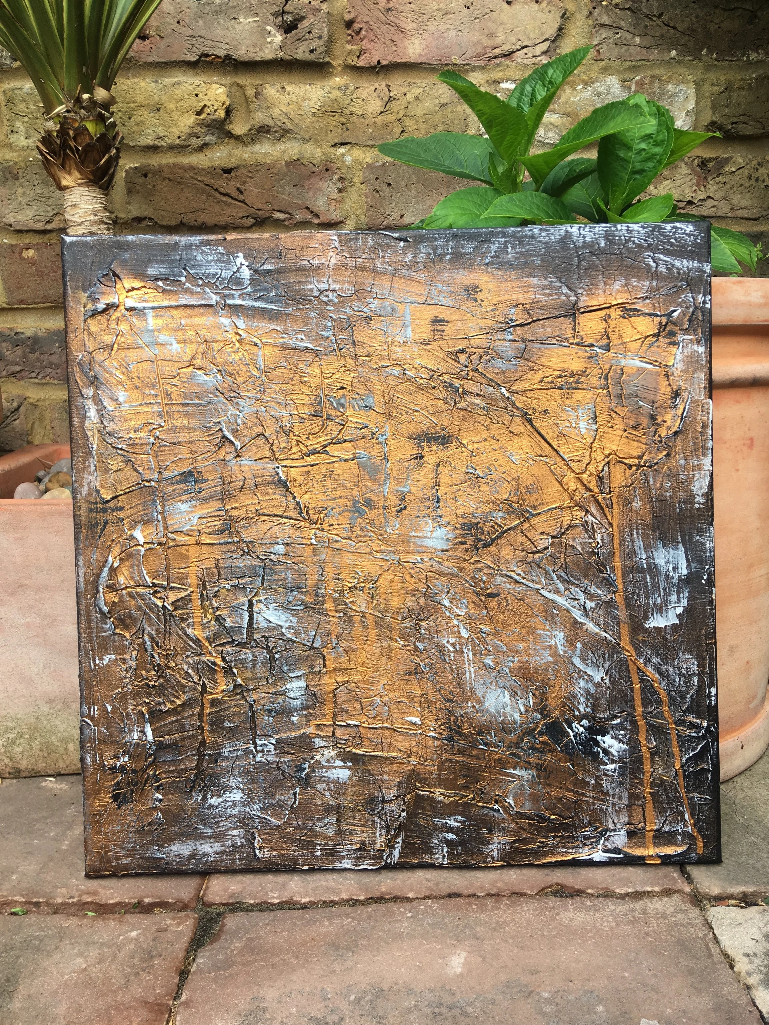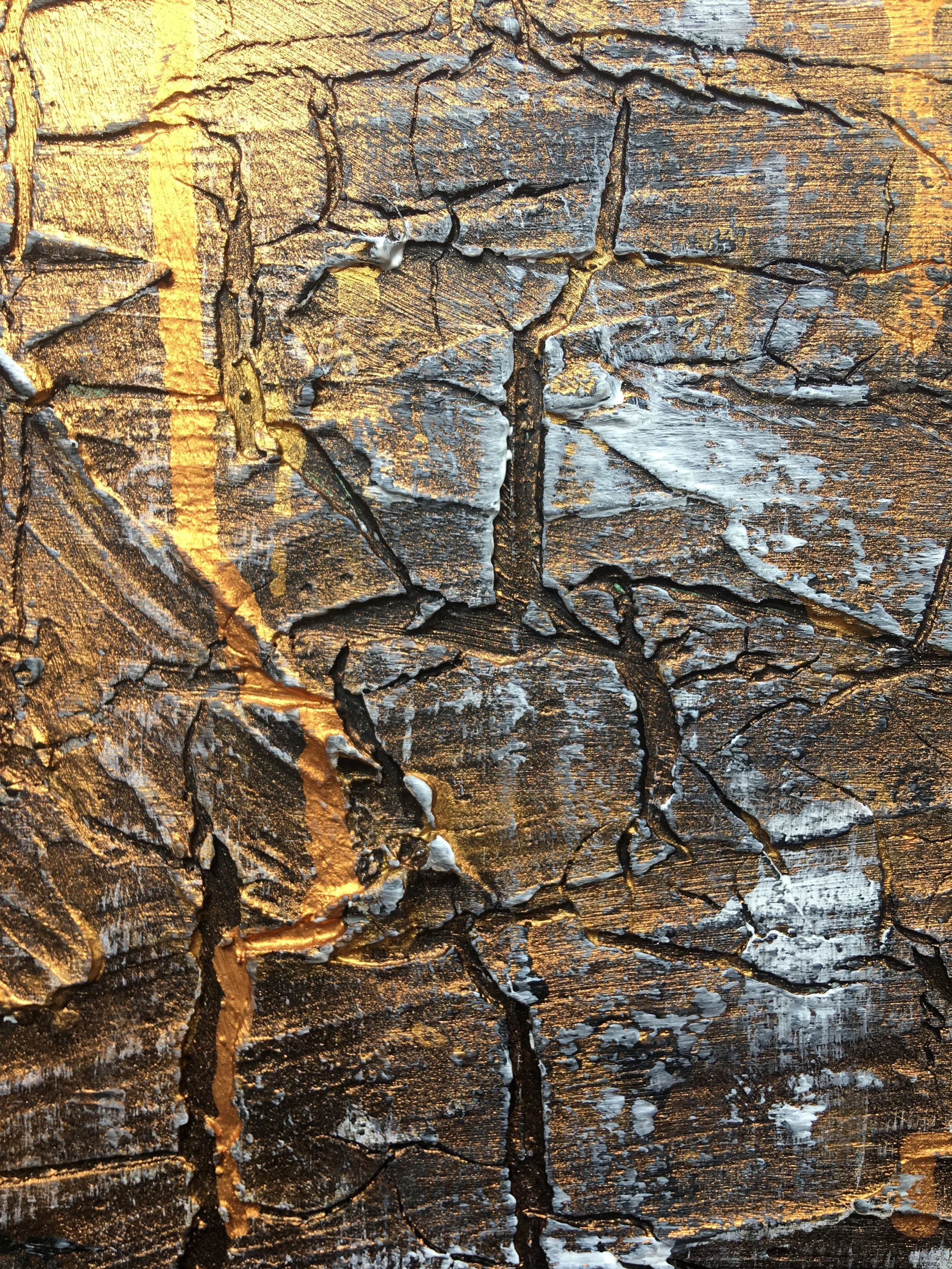 This gold, black, white and grey painting is created using acrylic and spray paints over a cracked clay surface on a canvas measuring 40cm x 40cm x 2cm.