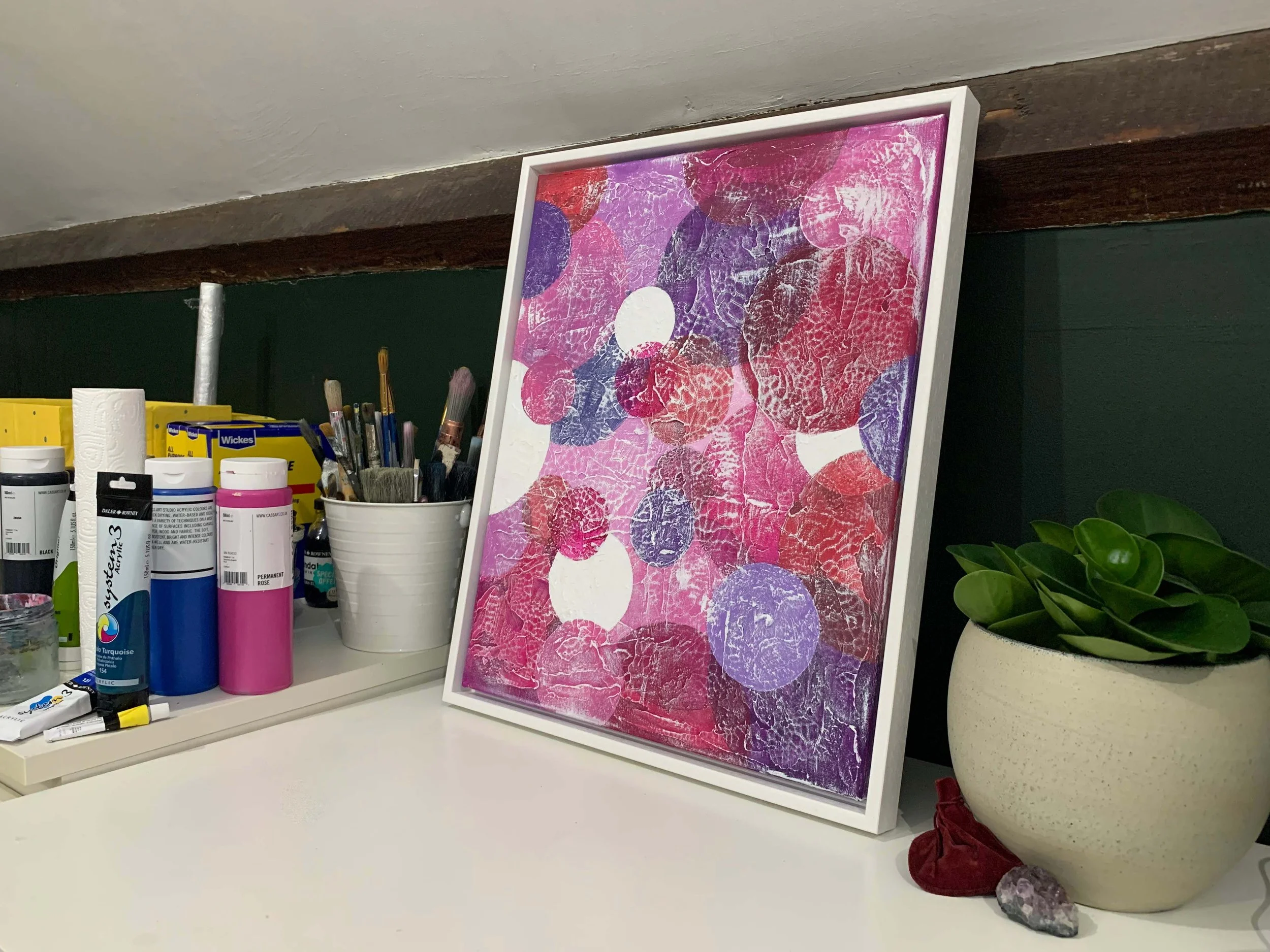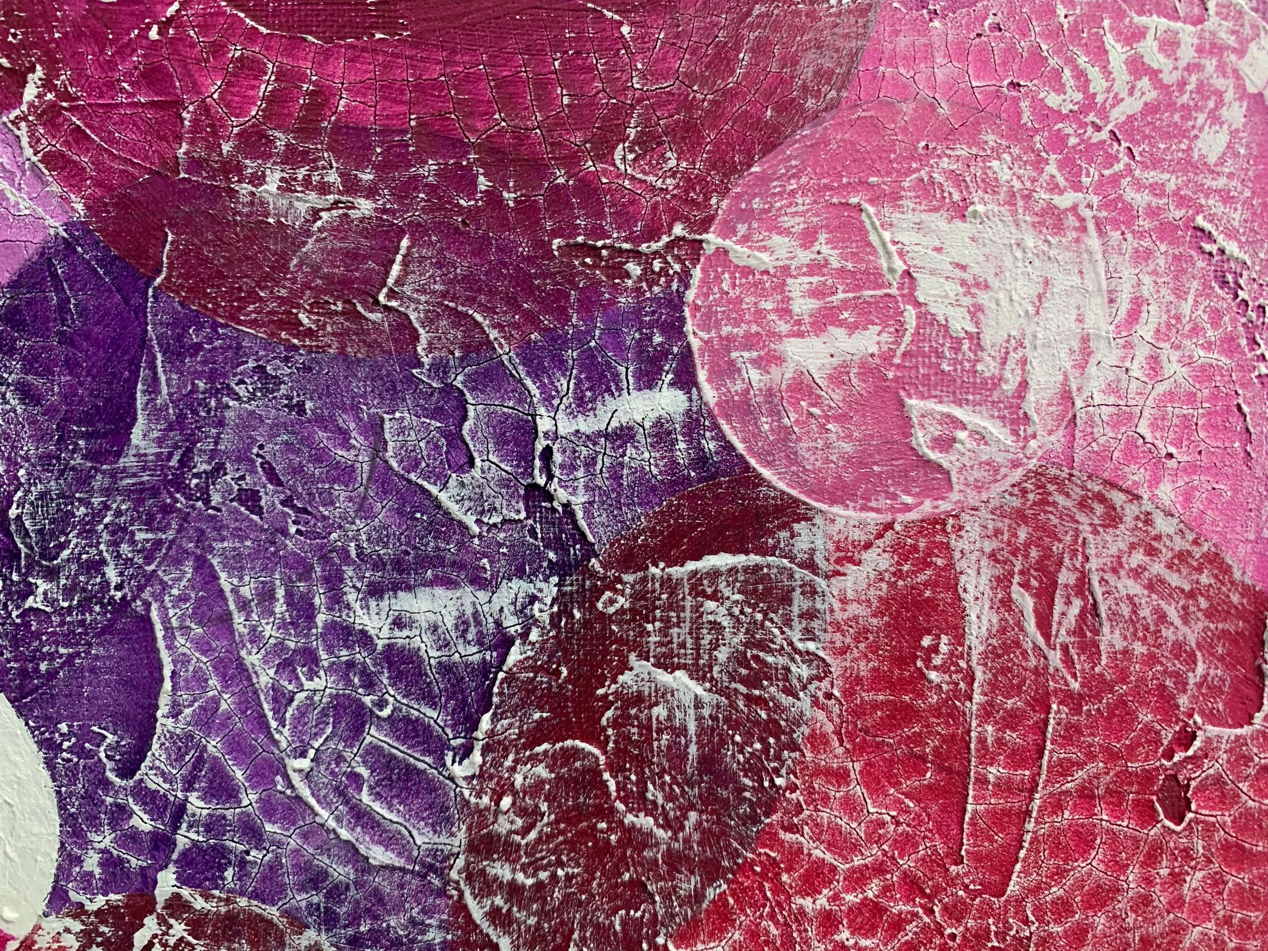 Nostalgic Romance is a beautiful abstract painting in pink and purple tones, using cracking clay and acrylic paints on canvas.