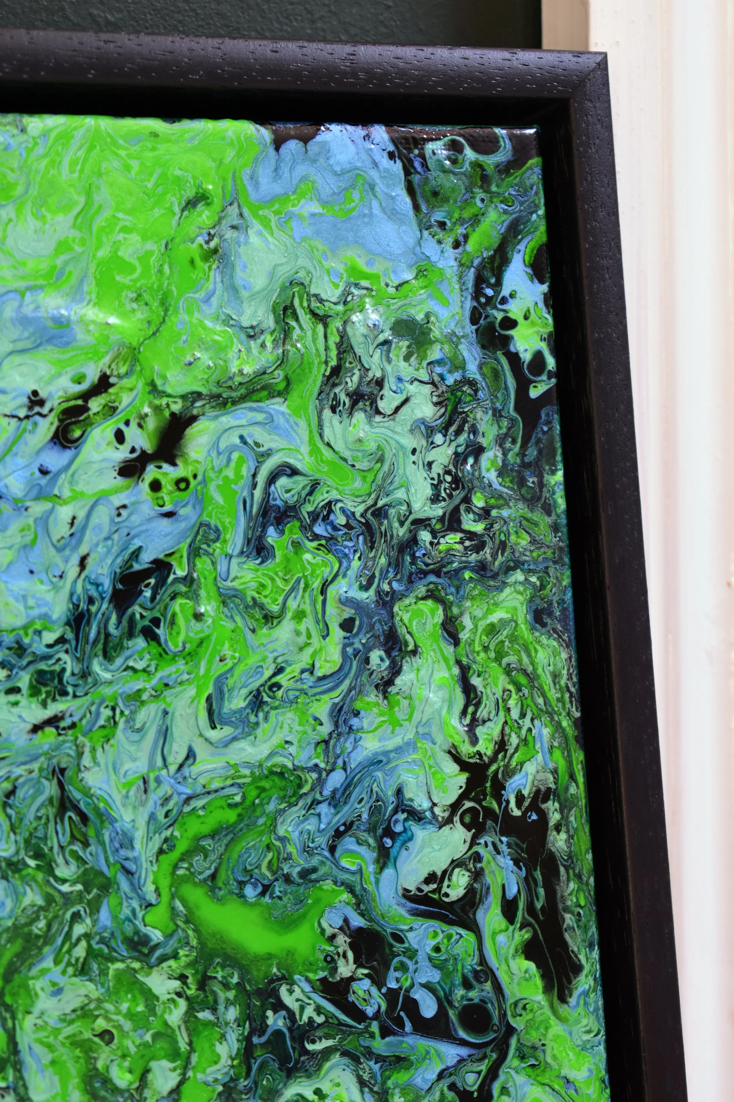 Oil Spill is fixed within a black stained oak frame that measures 33.5cm x 33.5cm x 3.5cm.