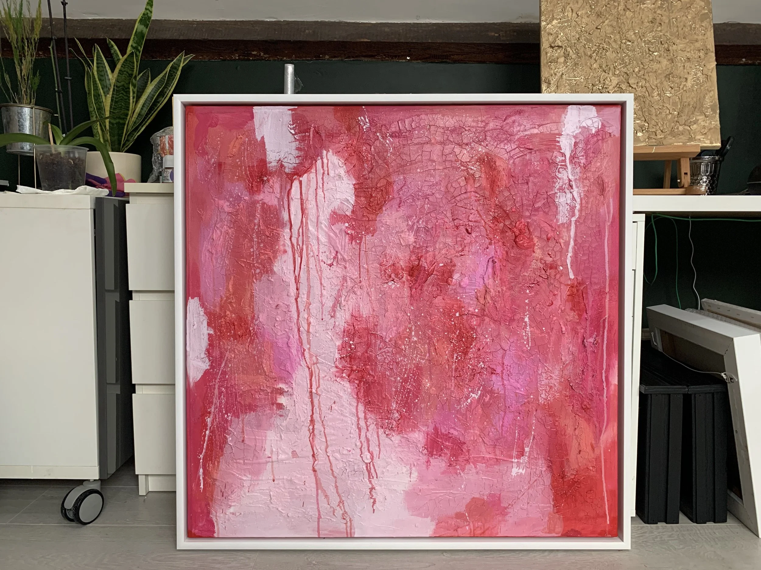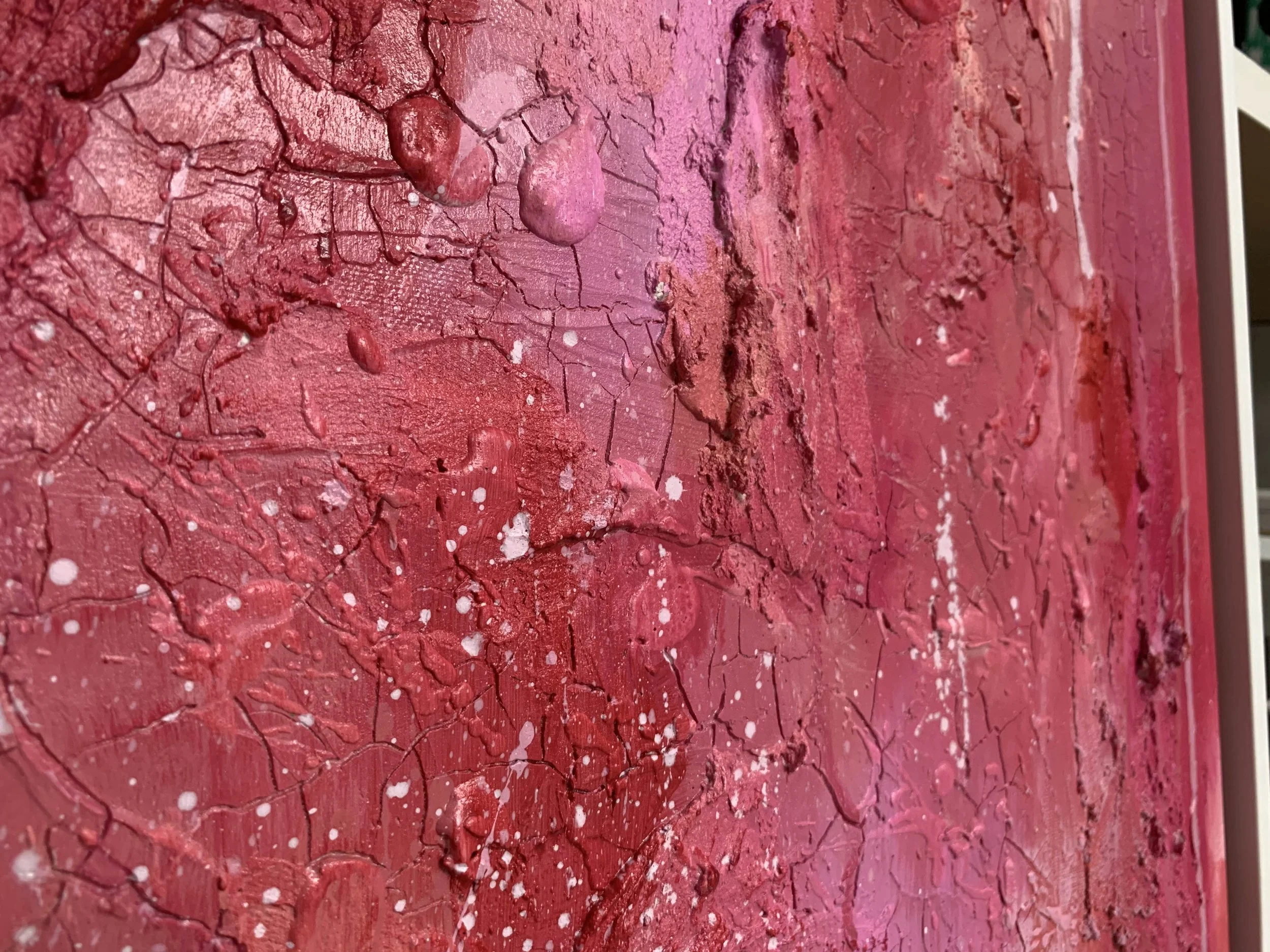 Samuel has used plaster on stretched cotton canvas to create a heavily textured surface. He has dabbed, brushed and splattered various shades of pink acrylic paint over this surface to create an energetic and striking composition. The painting is then finished with a layer of PVA to strengthen the surface and to create a slightly glossy surface which emphasises the plasters texture.