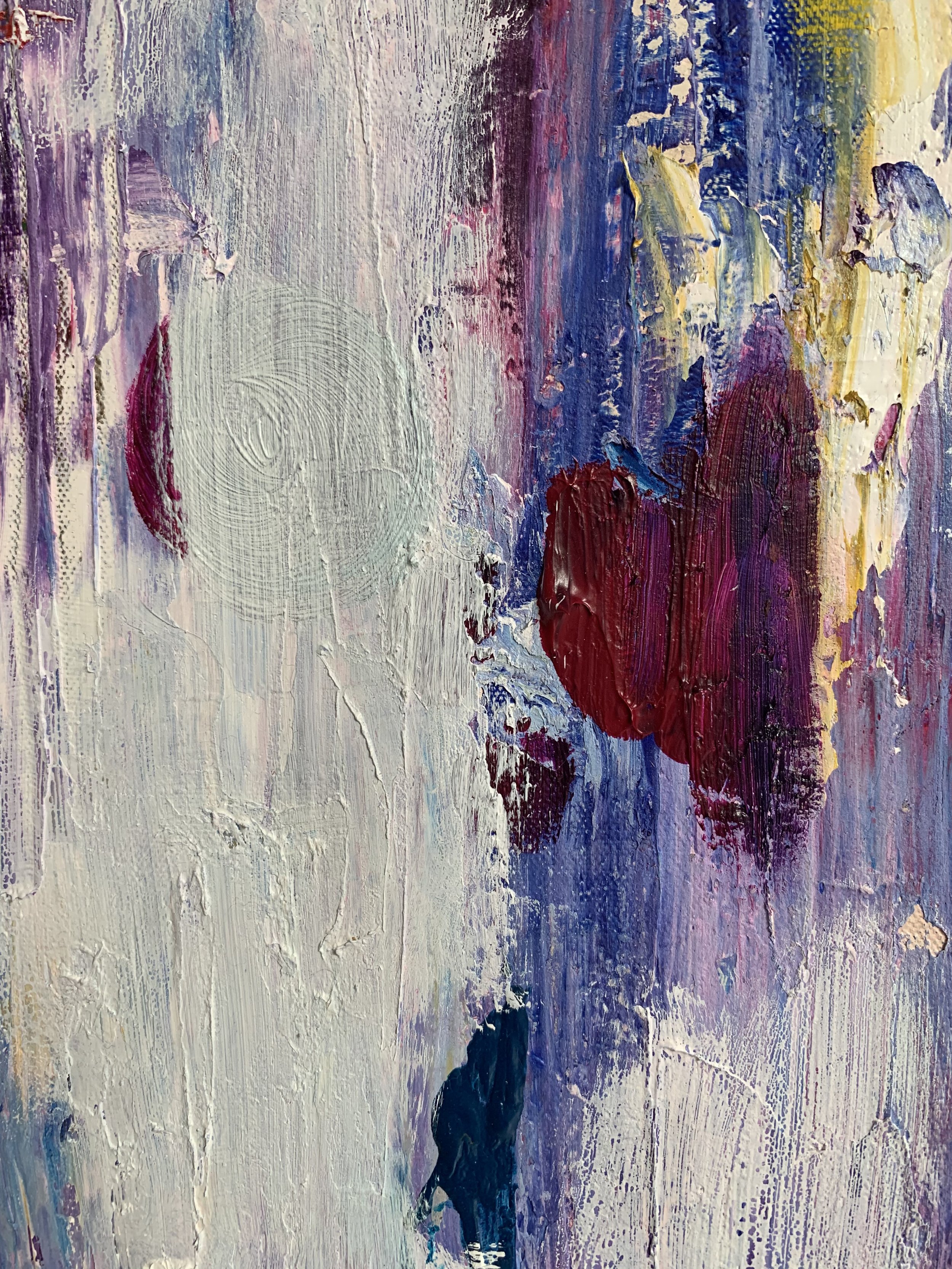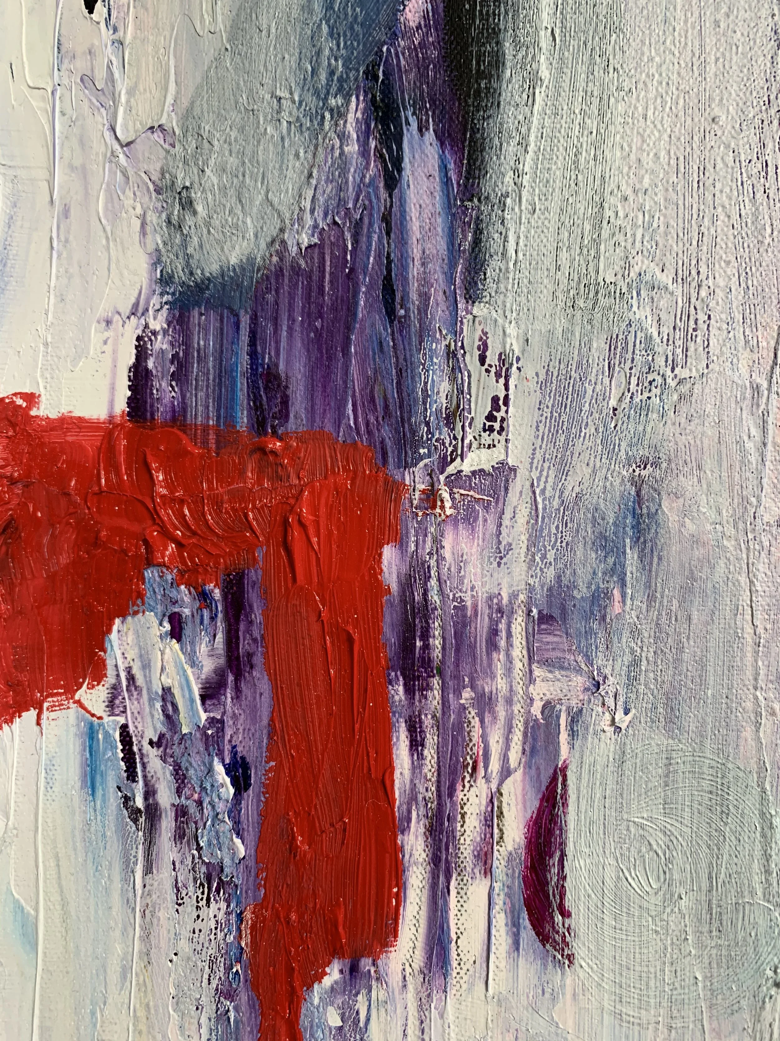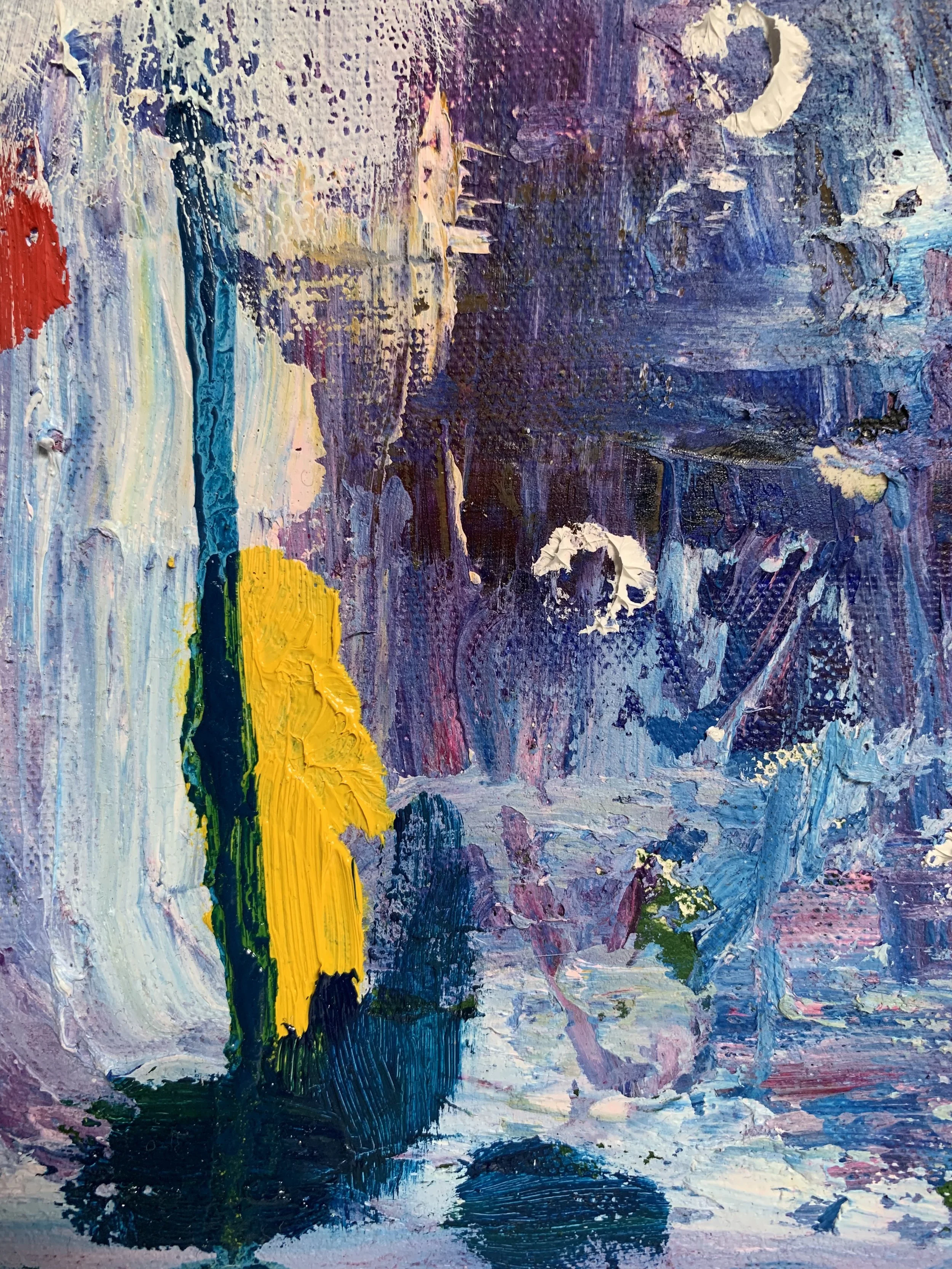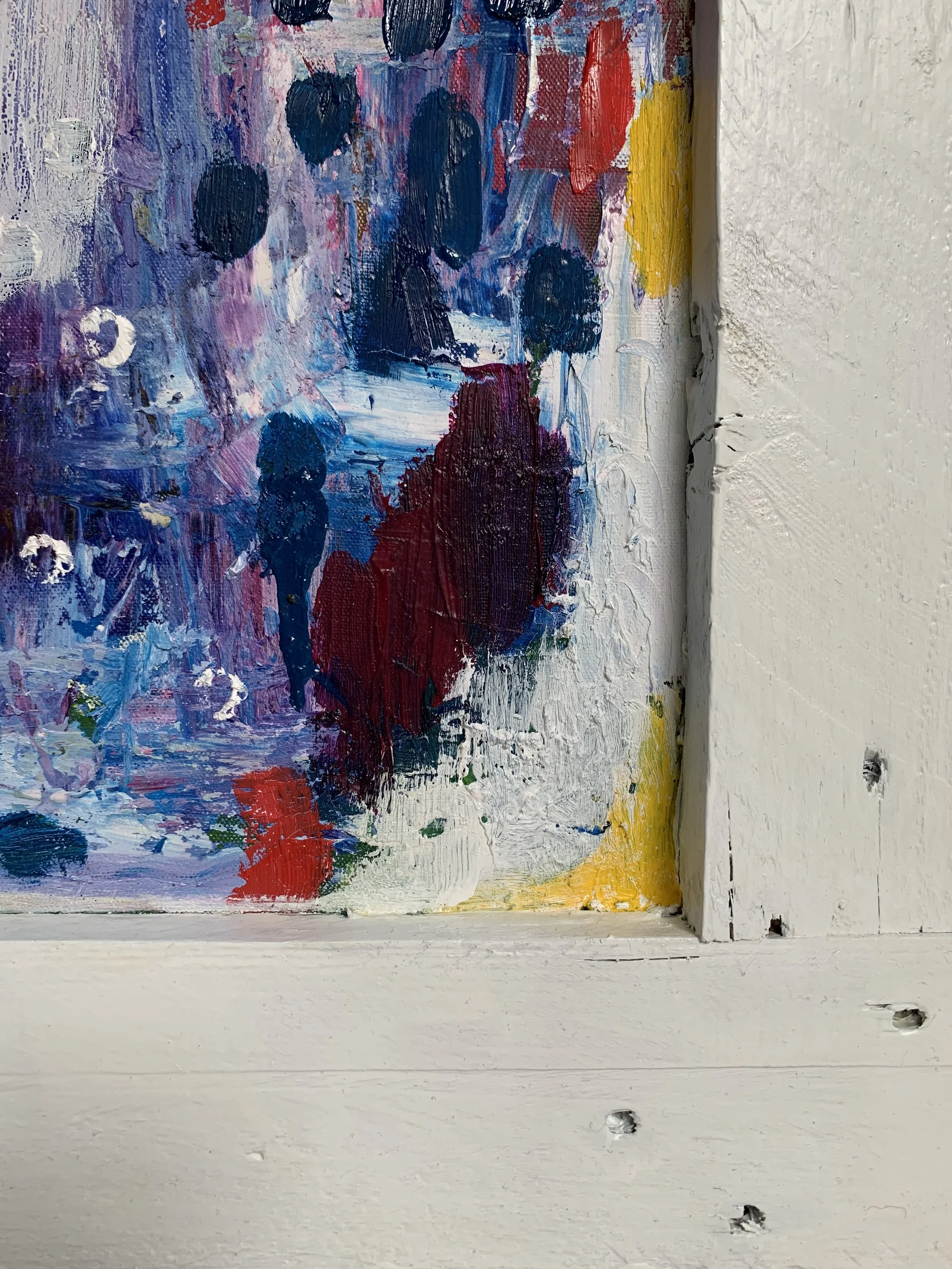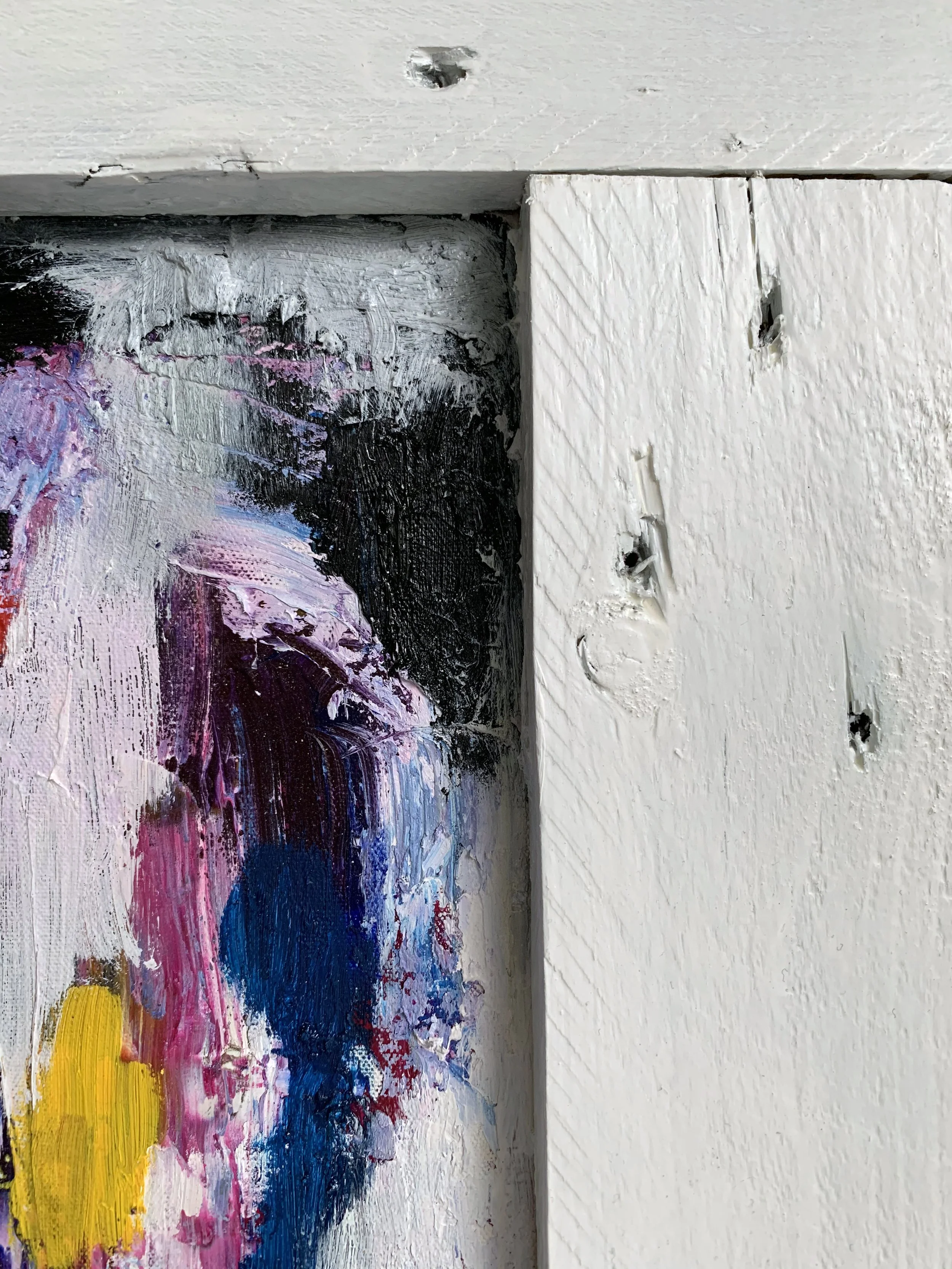This painting began as an upcycling project. Samuel loves texture and could not throw away this wooden palette, so he disassembled it, sanded the roughest edges and turned the leftover into paintings. Once the frame had been assembled and finished with wood primer and matt varnish, the canvas was stretched and gessoed. Then the layering process began, with oils and acrylics applied using brushes and knives.