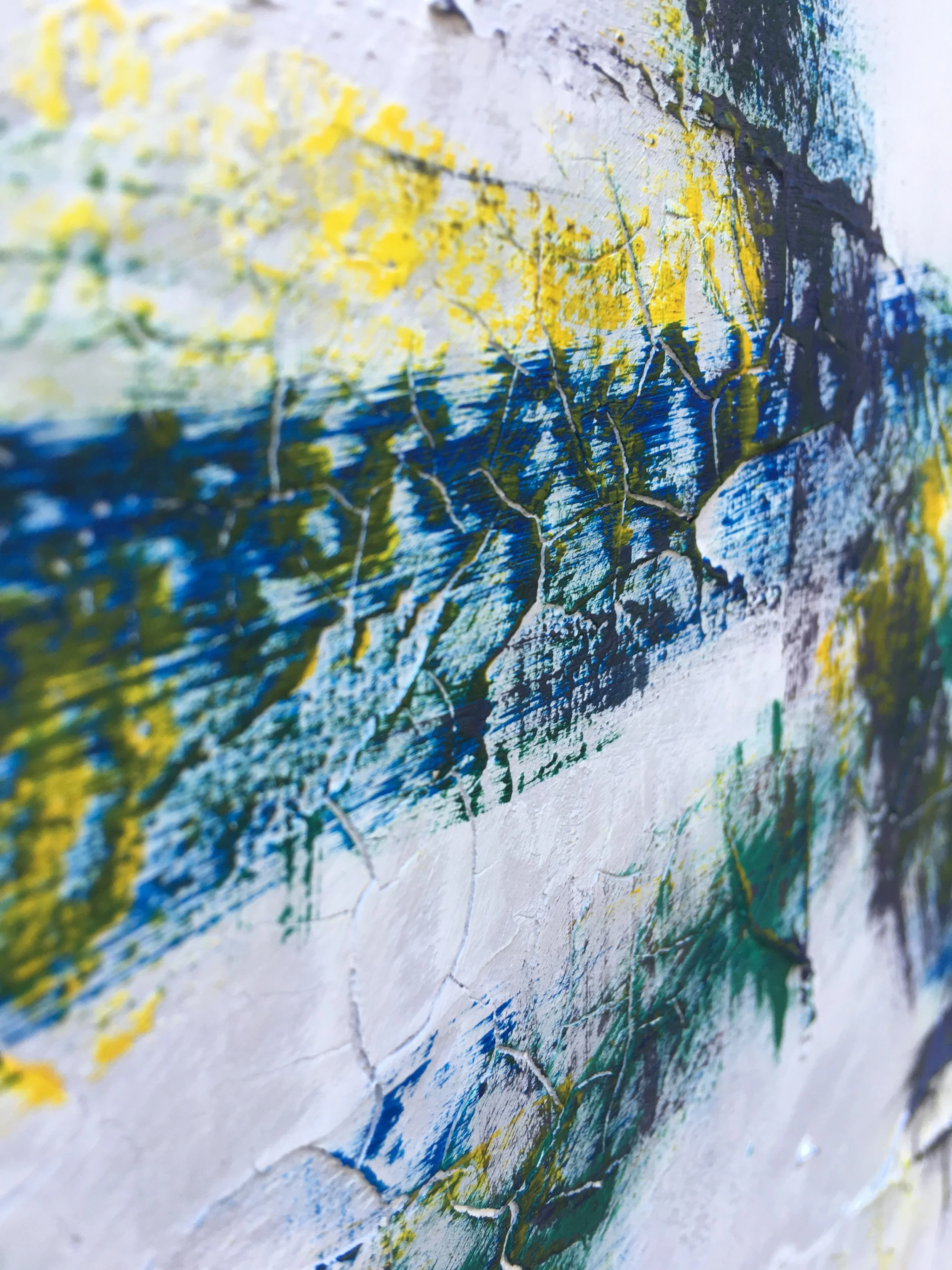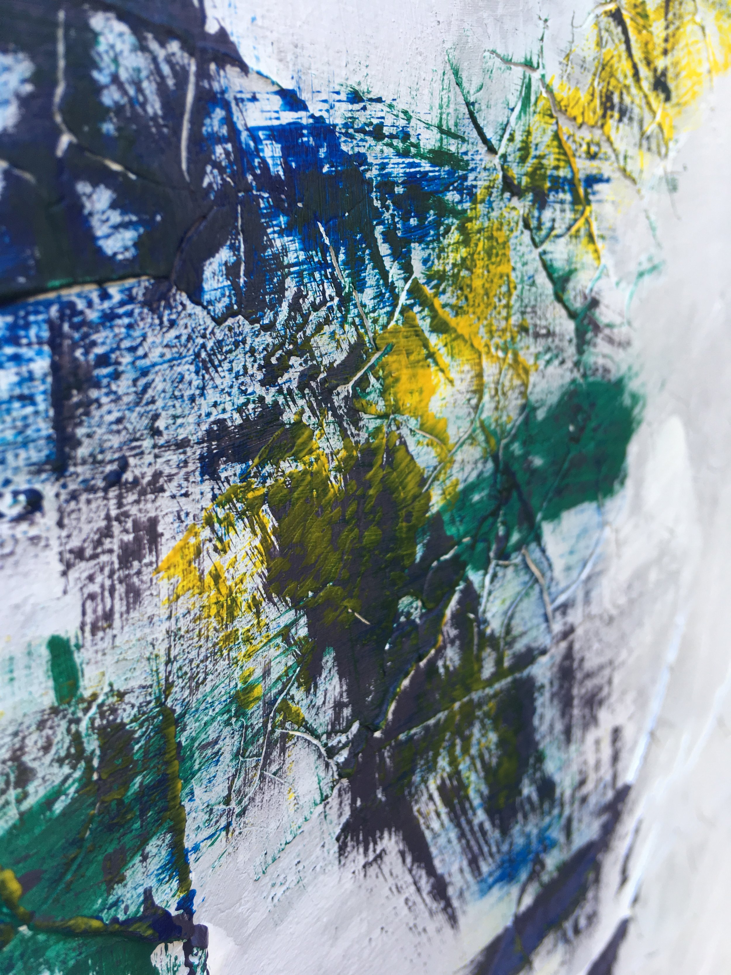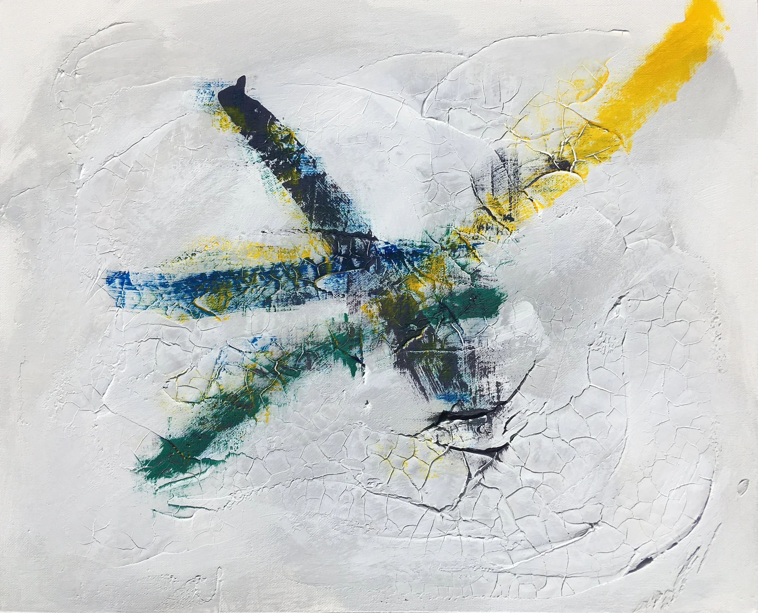 'Challenge' is an original abstract painting using acrylic paints on a cracked clay surface on canvas measuring 40cm x 51cm.