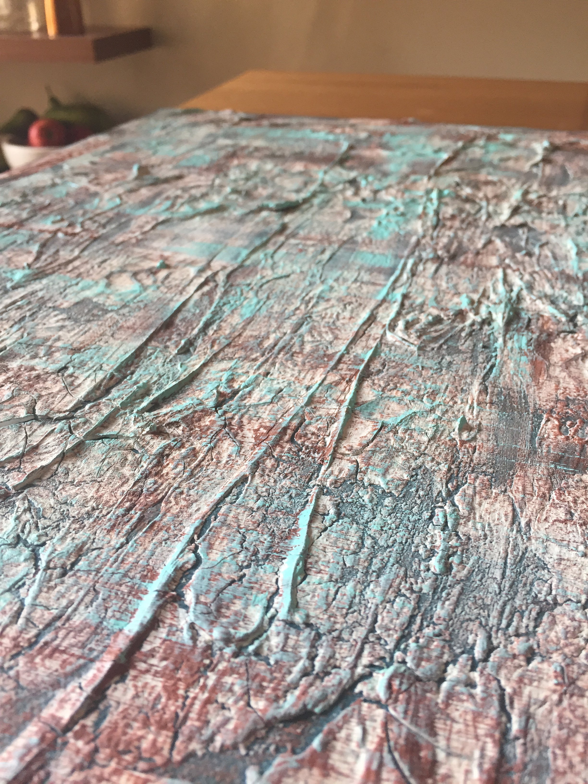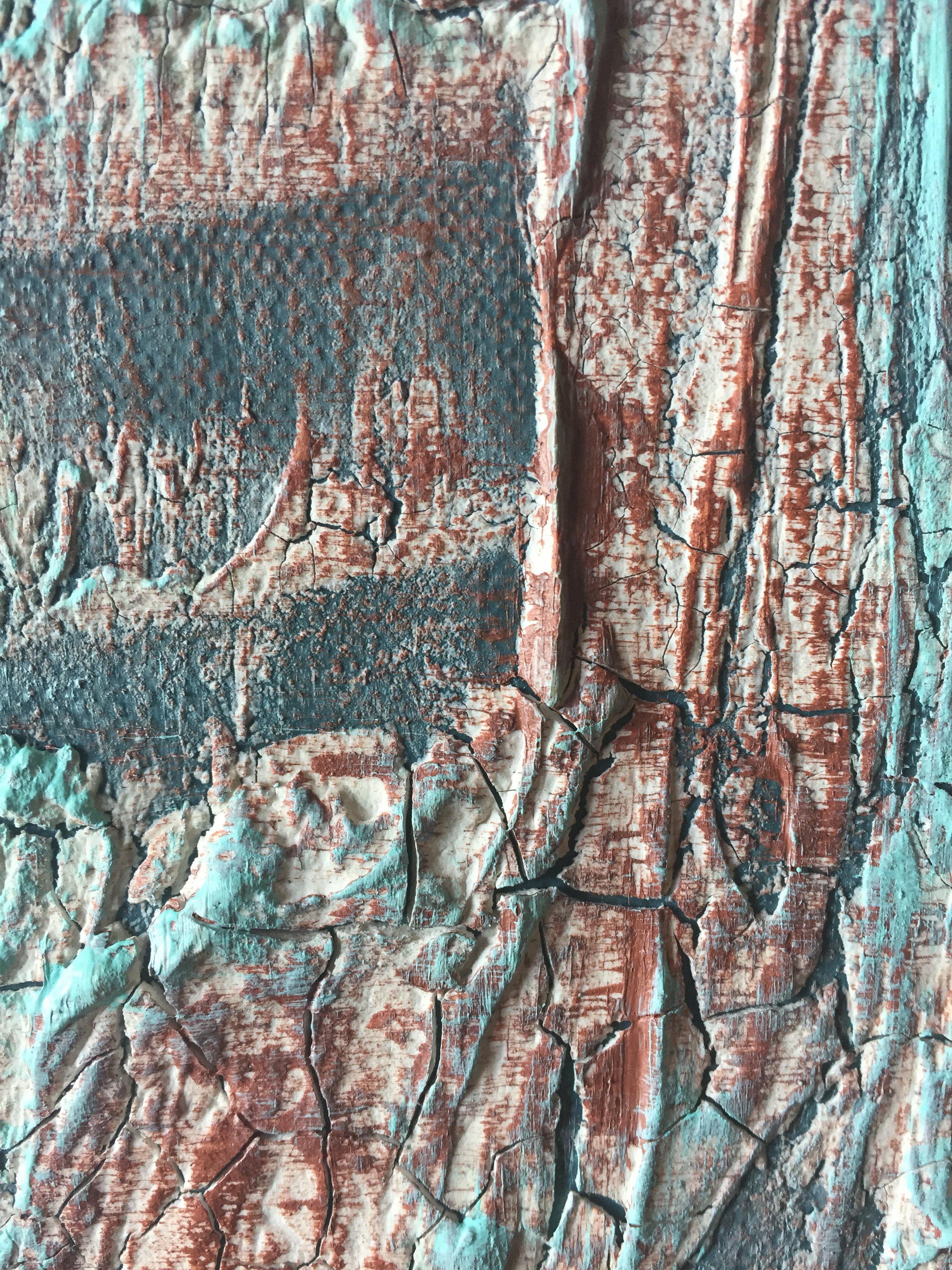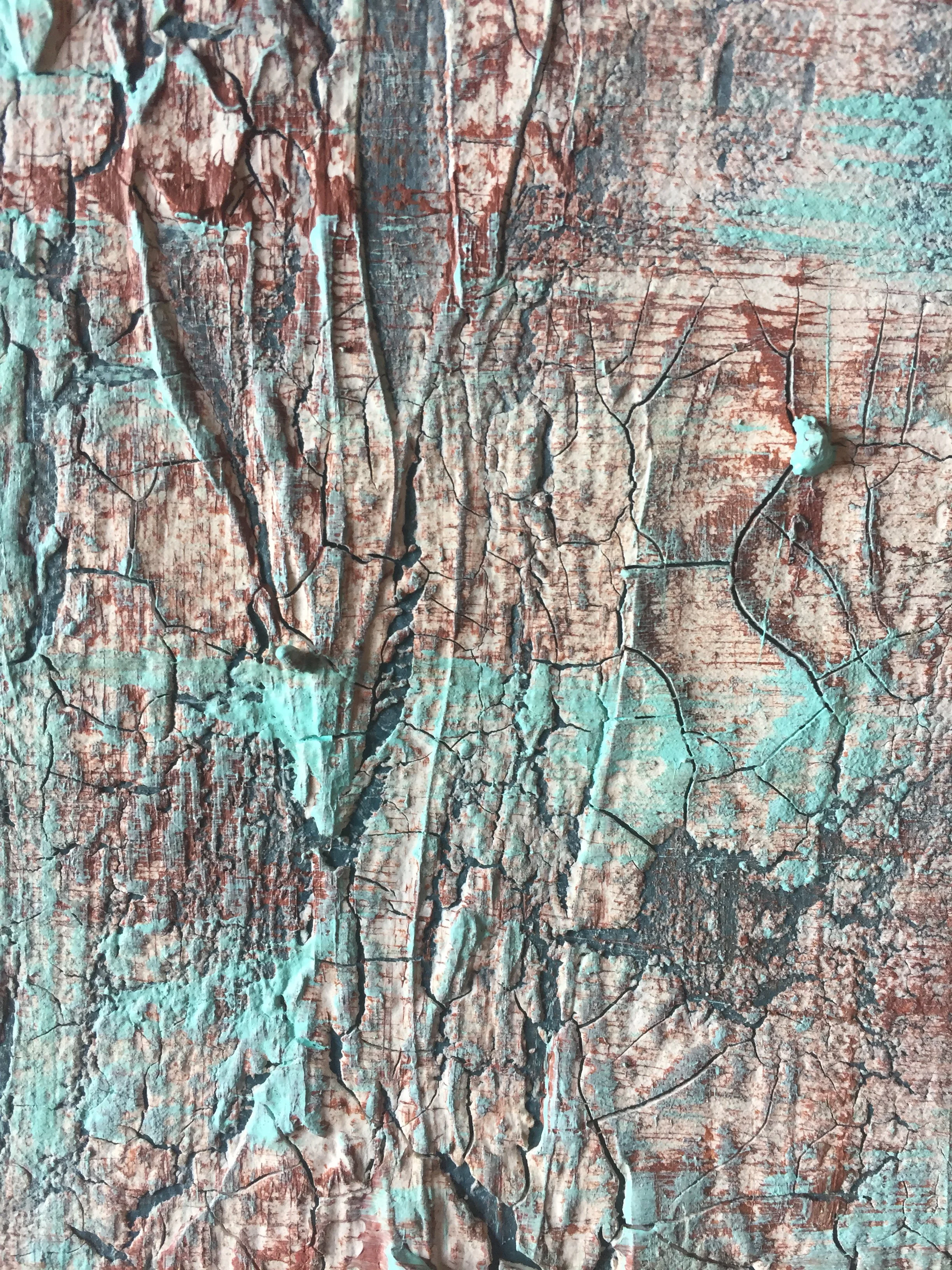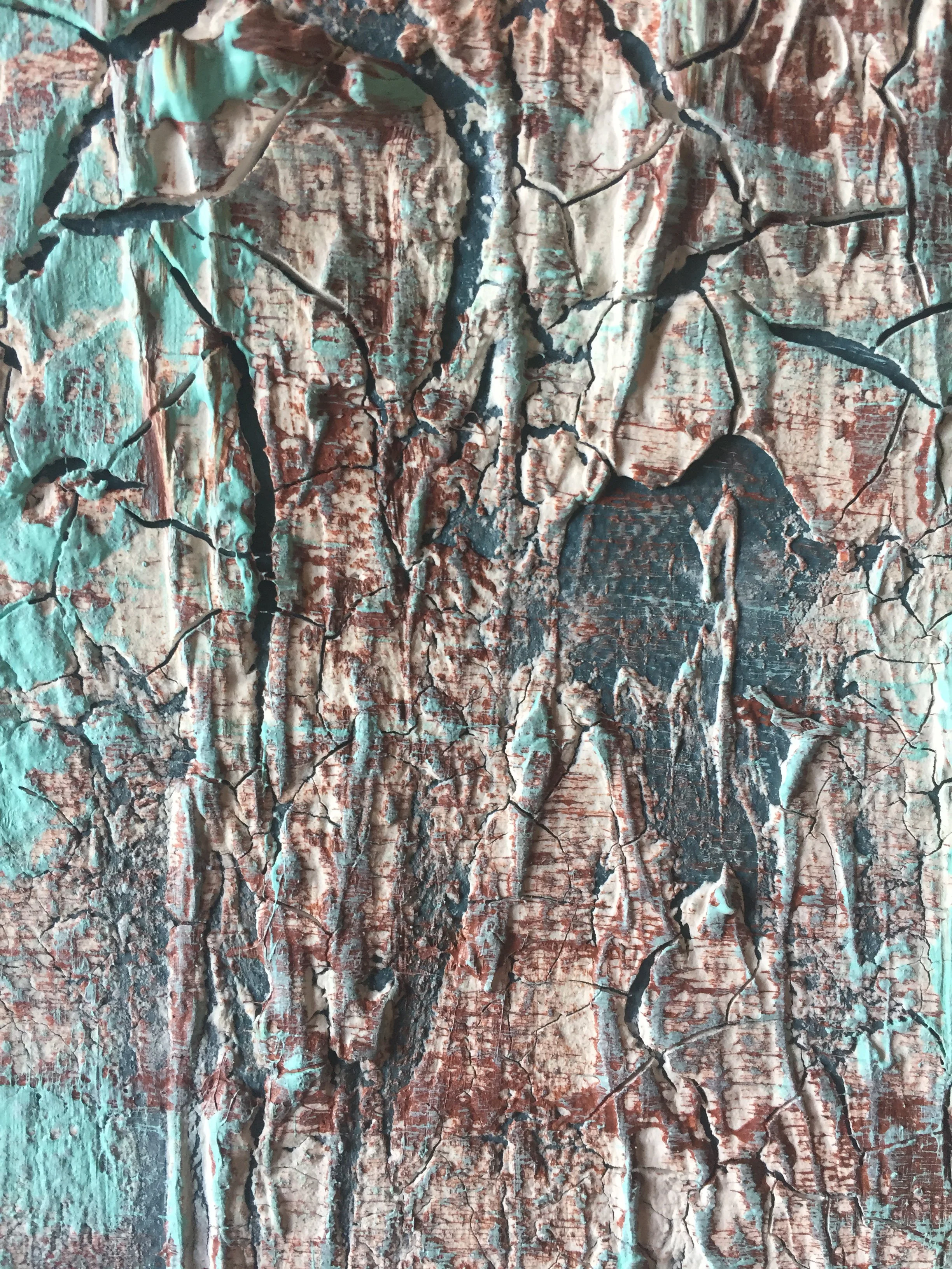 This high textured and beautifully detailed painting creates a big impact to the viewer, enticing them to look closer and closer into the cracks and layers created by the paint and clay.
