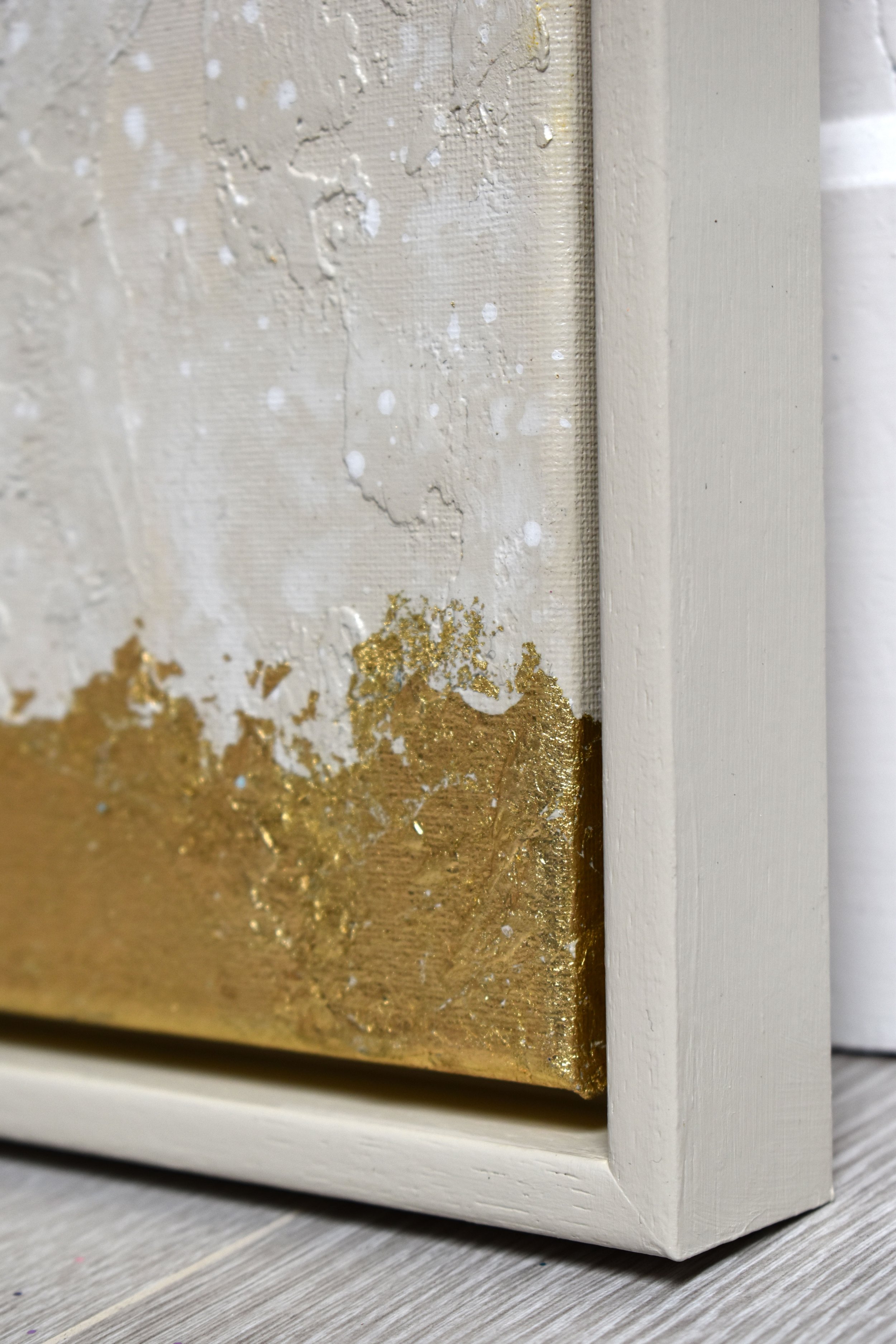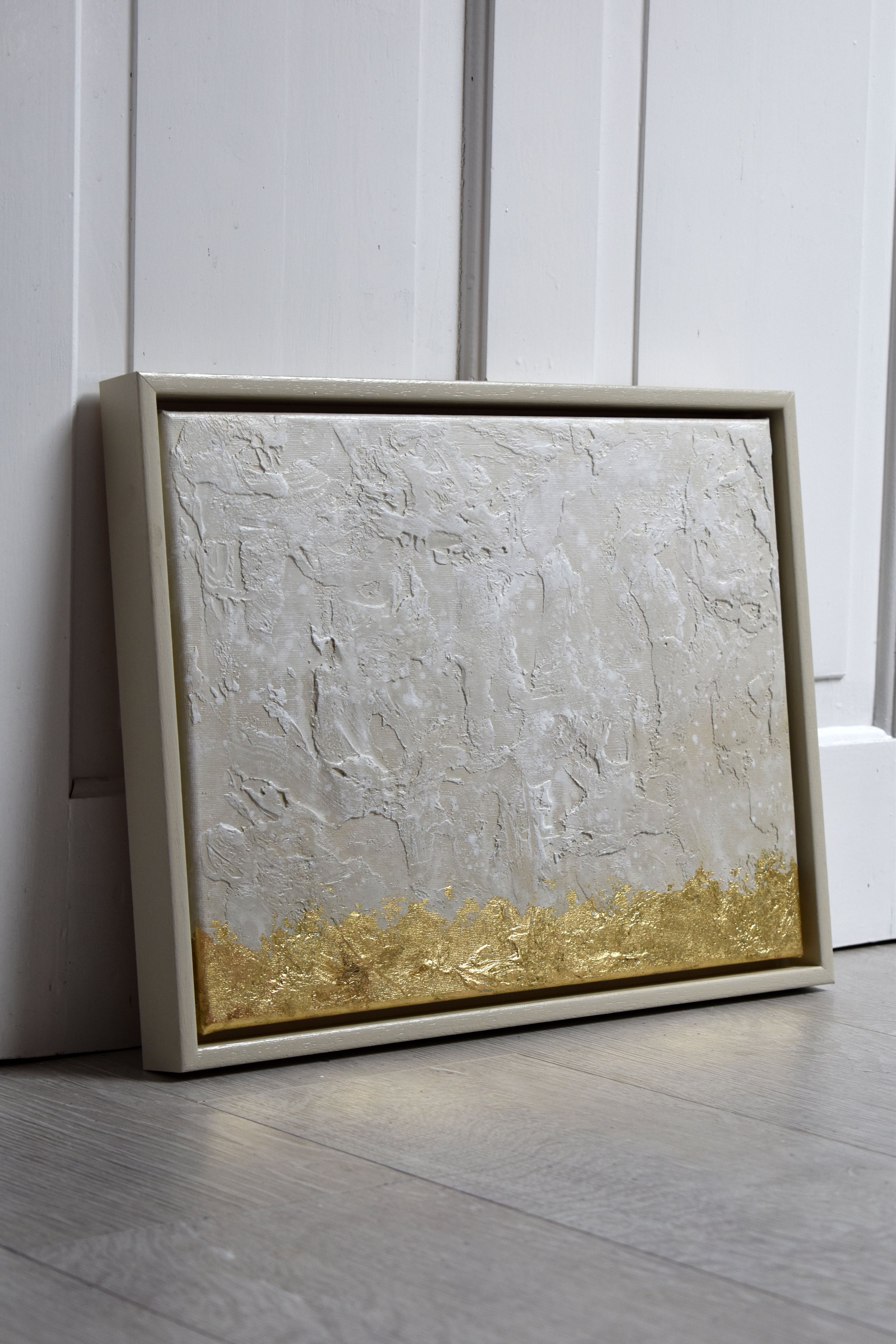 For Golden Horizon, Samuel has brushed and flicked a cashmere-coloured paint with white acrylic over the plaster surface, then applied a layer of gold leaf to the bottom portion of the canvas.