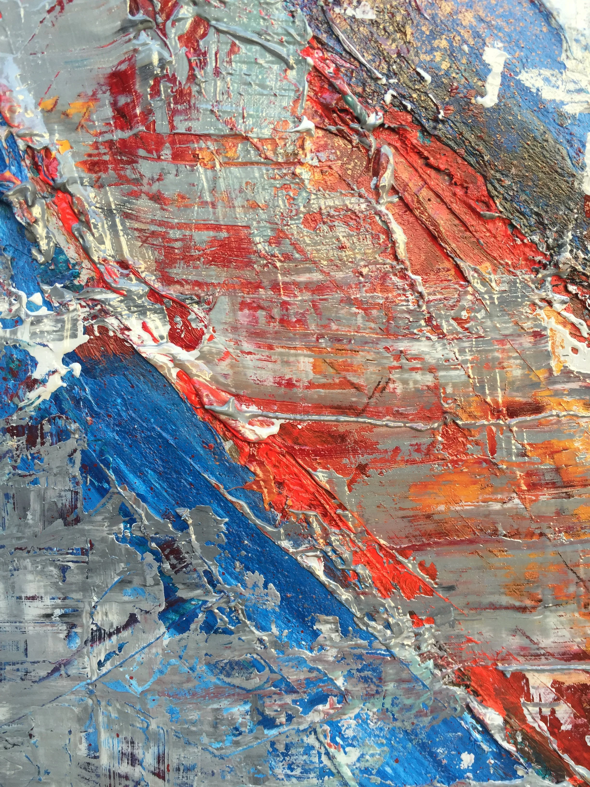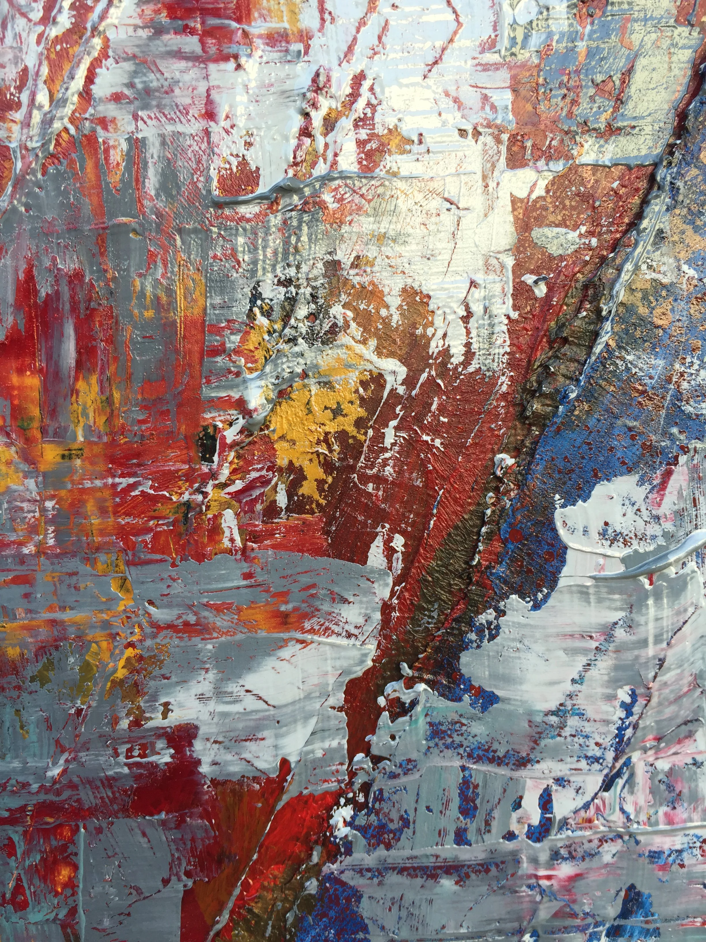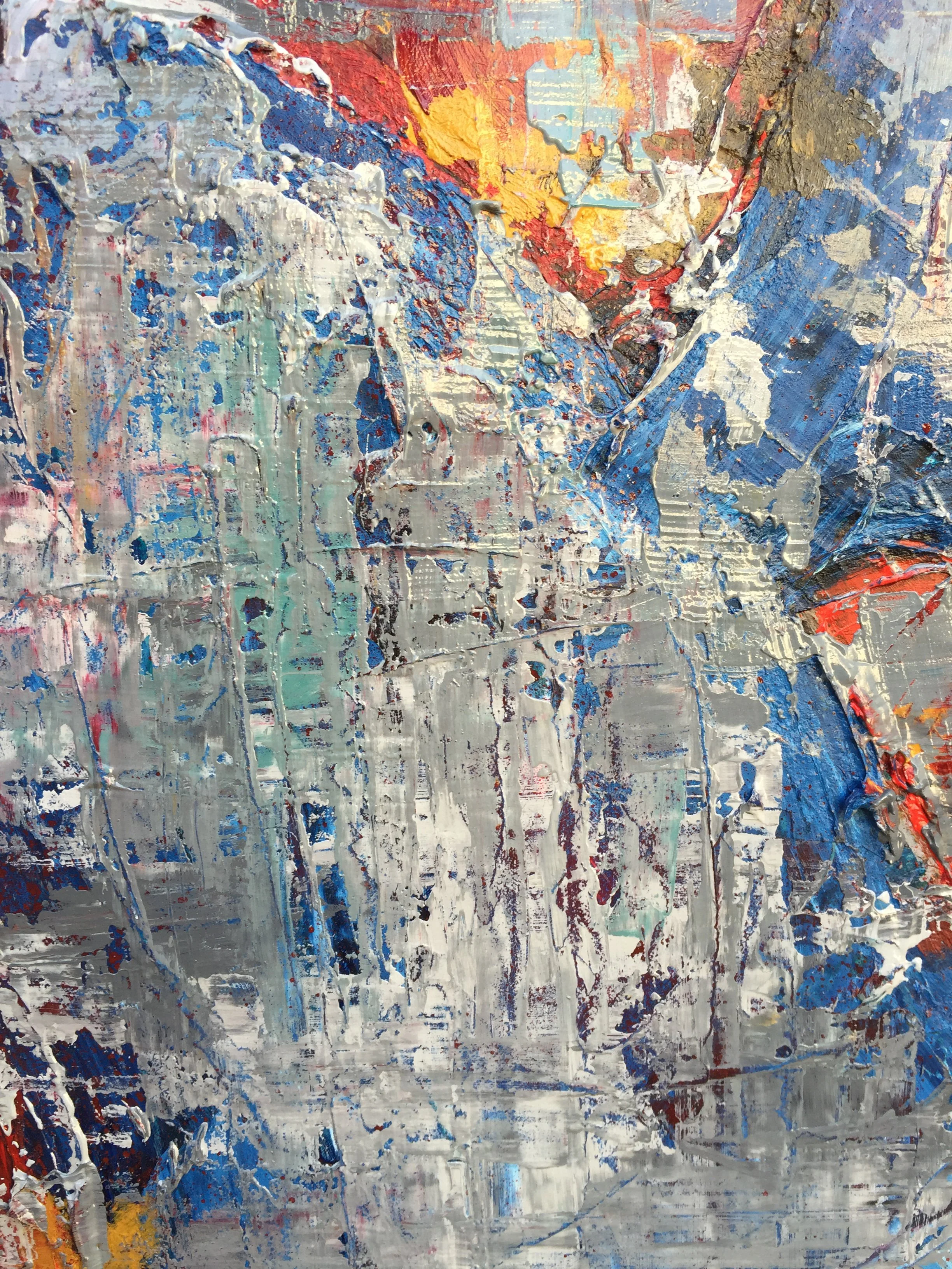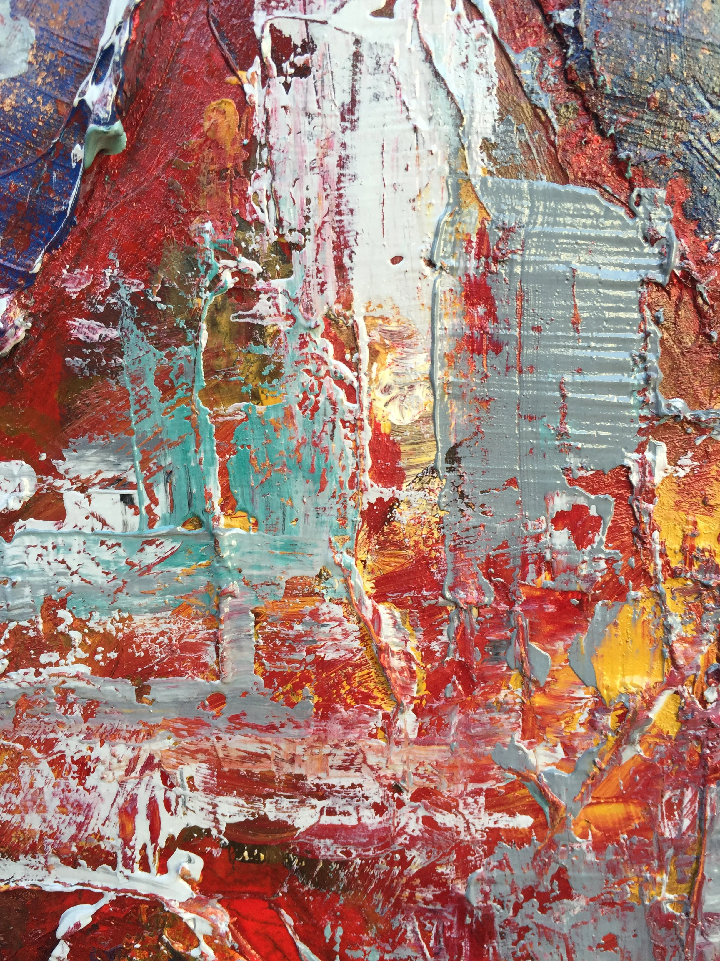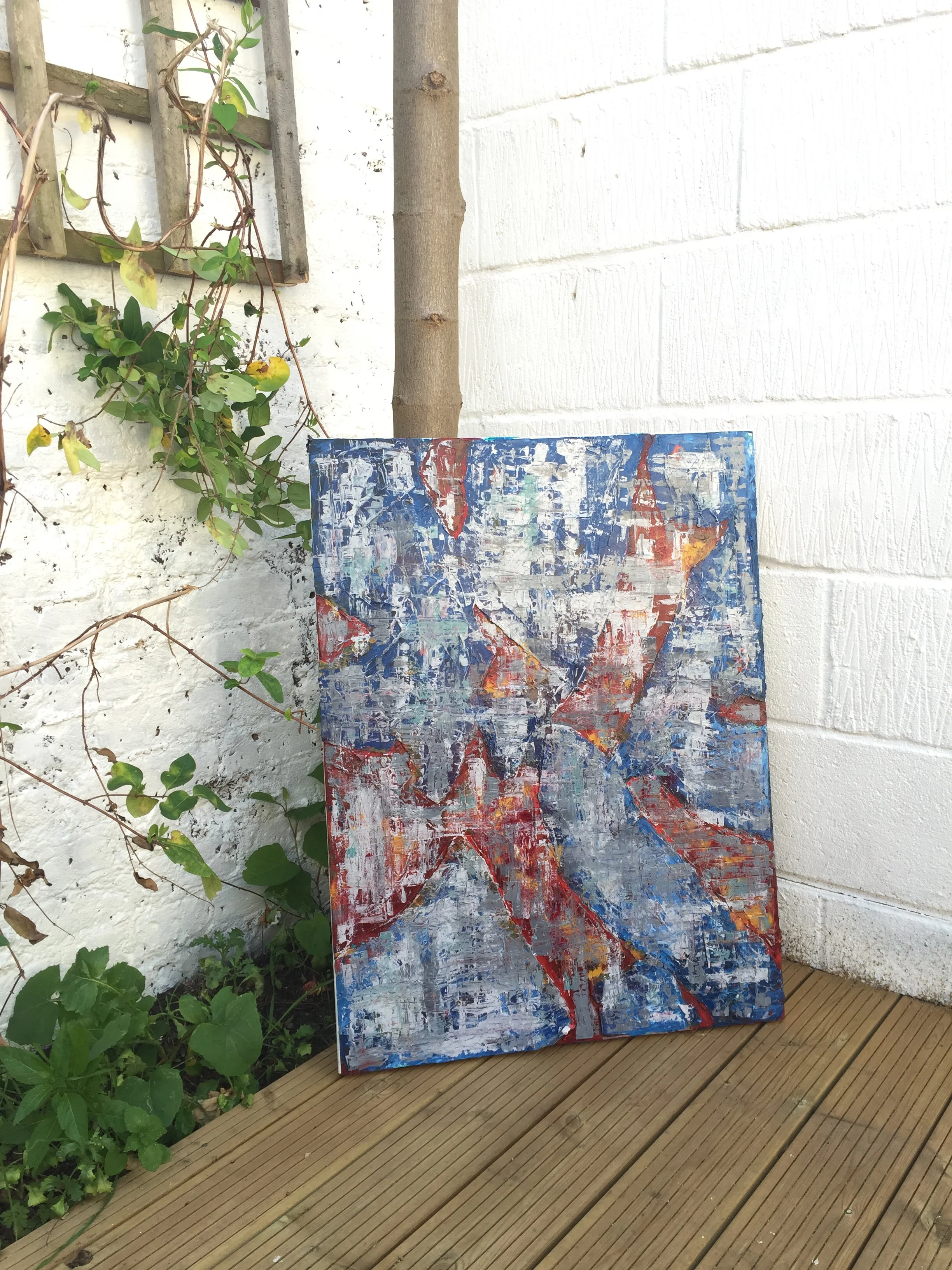 Thick mount board, oil and acrylic paint and spray paint have been layered to create this high impact composition which measures 90cm x 60cm