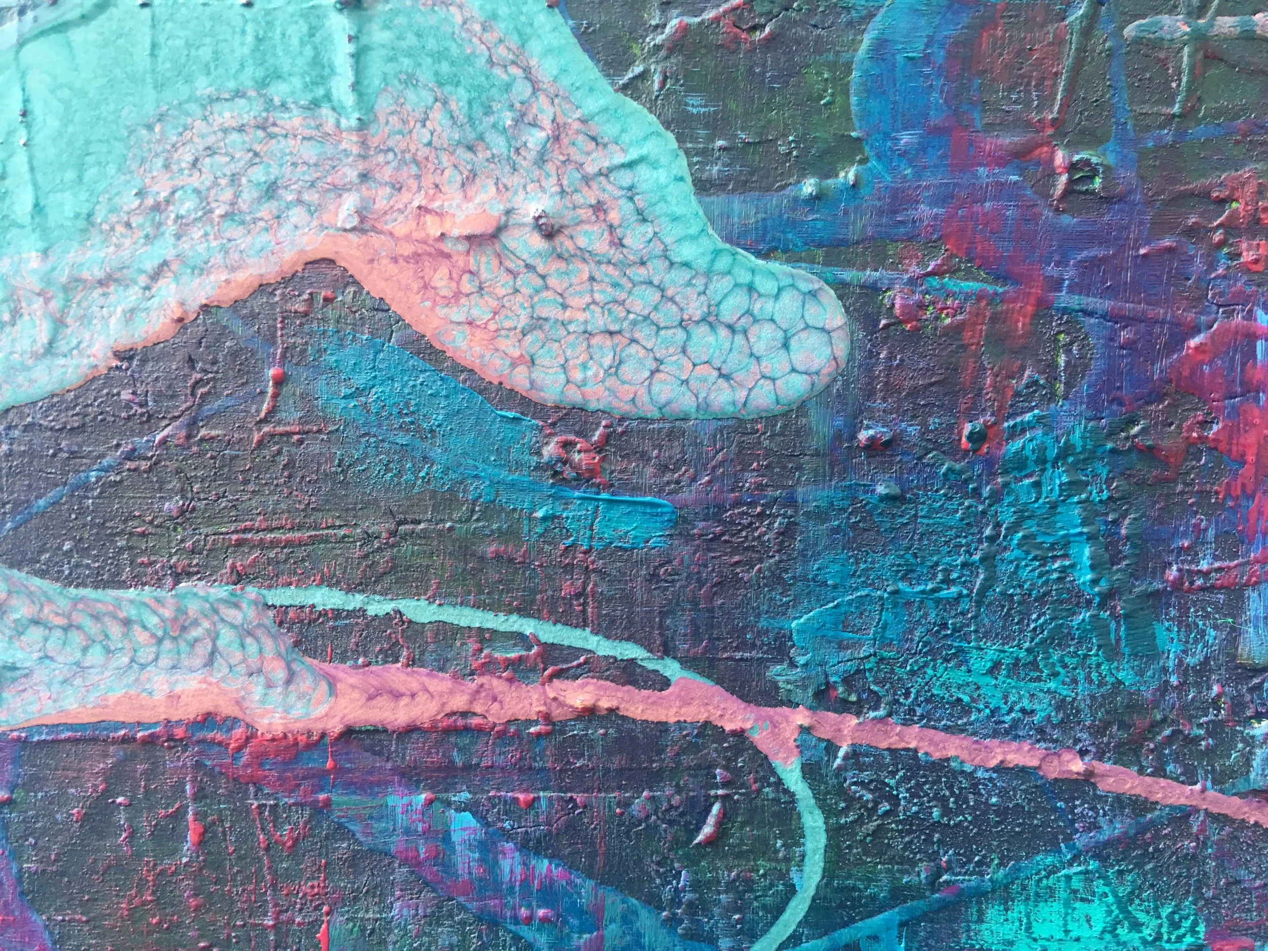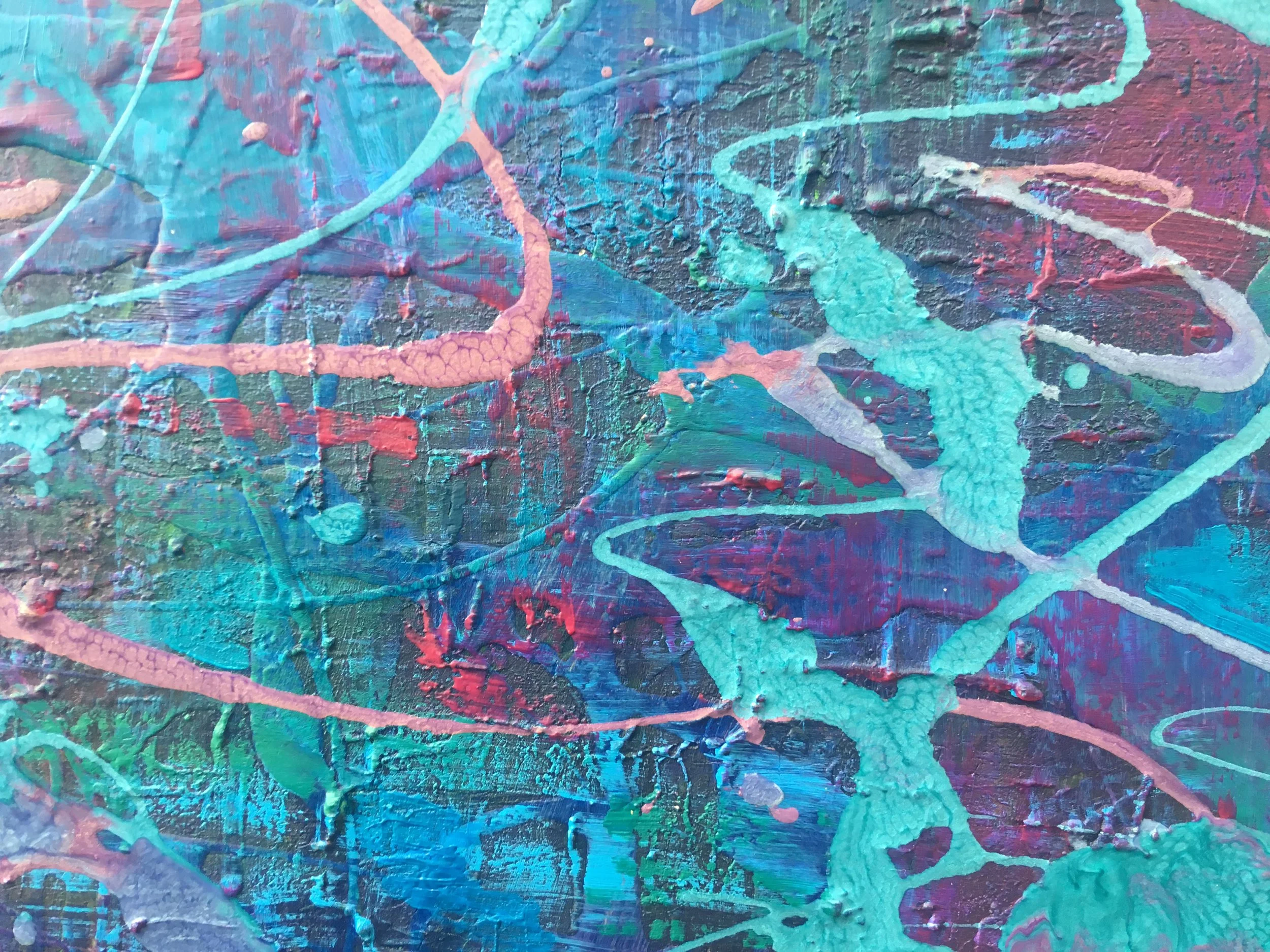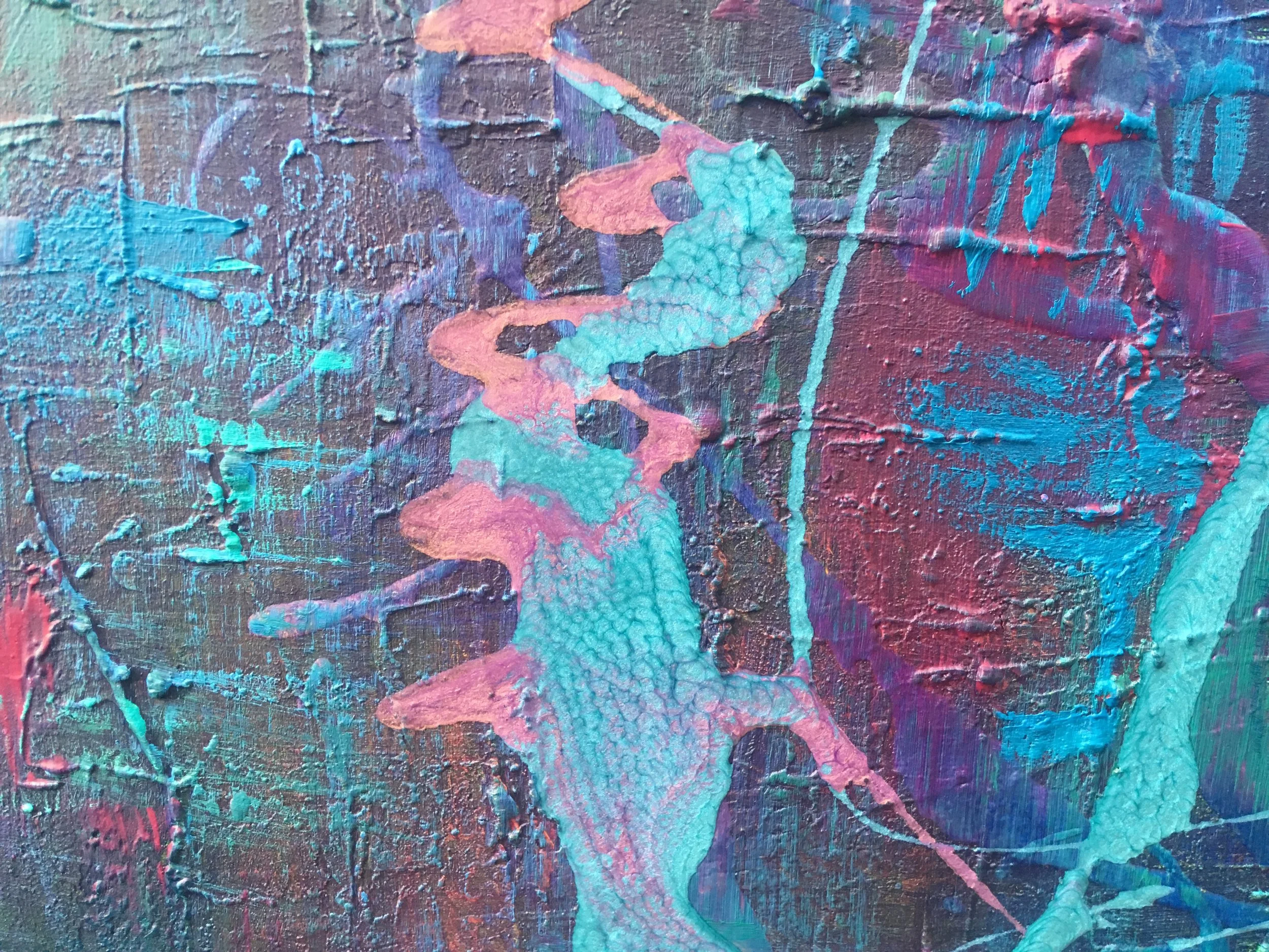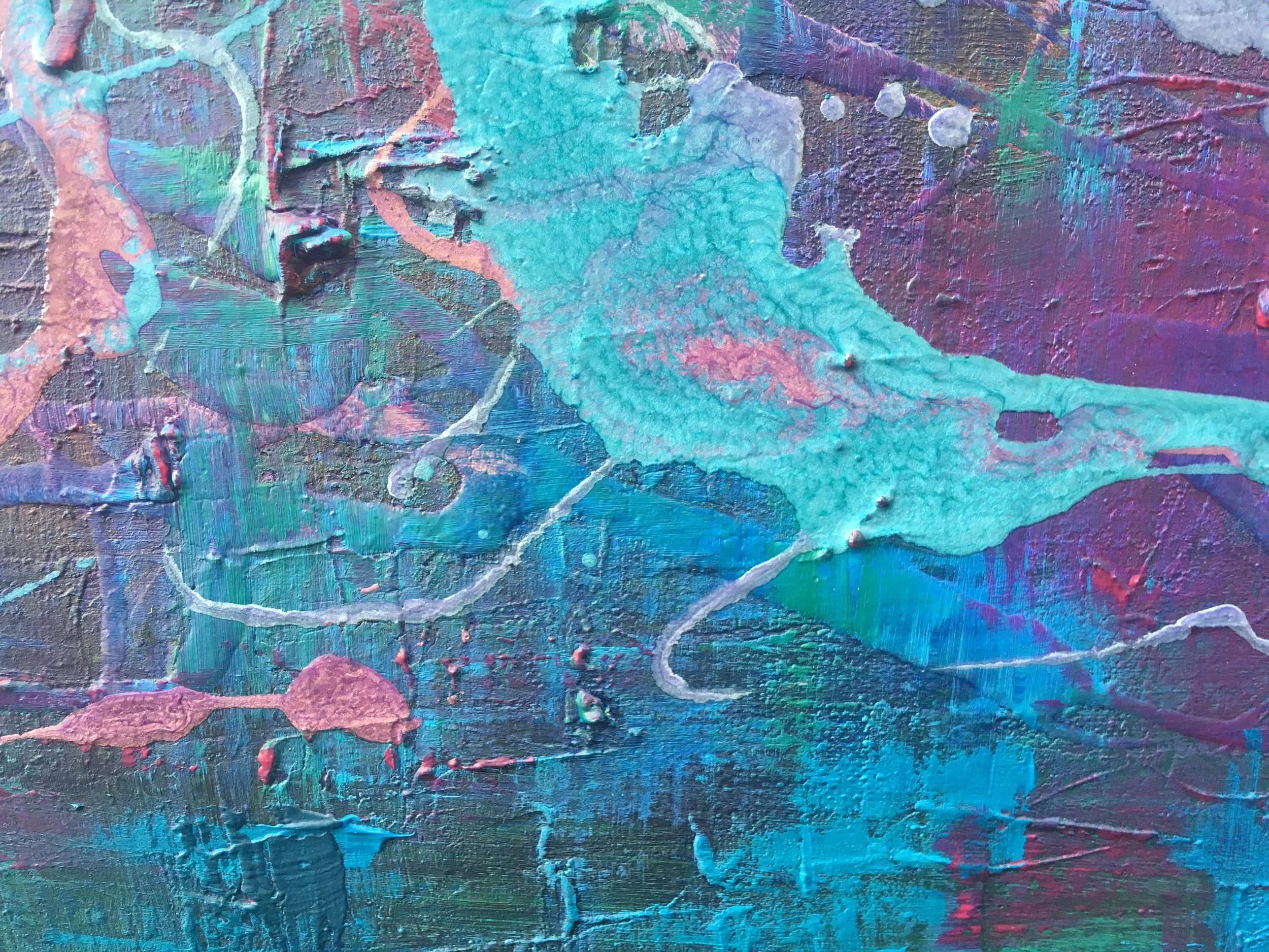 SSS is an 80cm x 60cm abstract painting created using acrylic and liquid paints in blue, turquoise, pink and purple tones over a textured clay canvas.