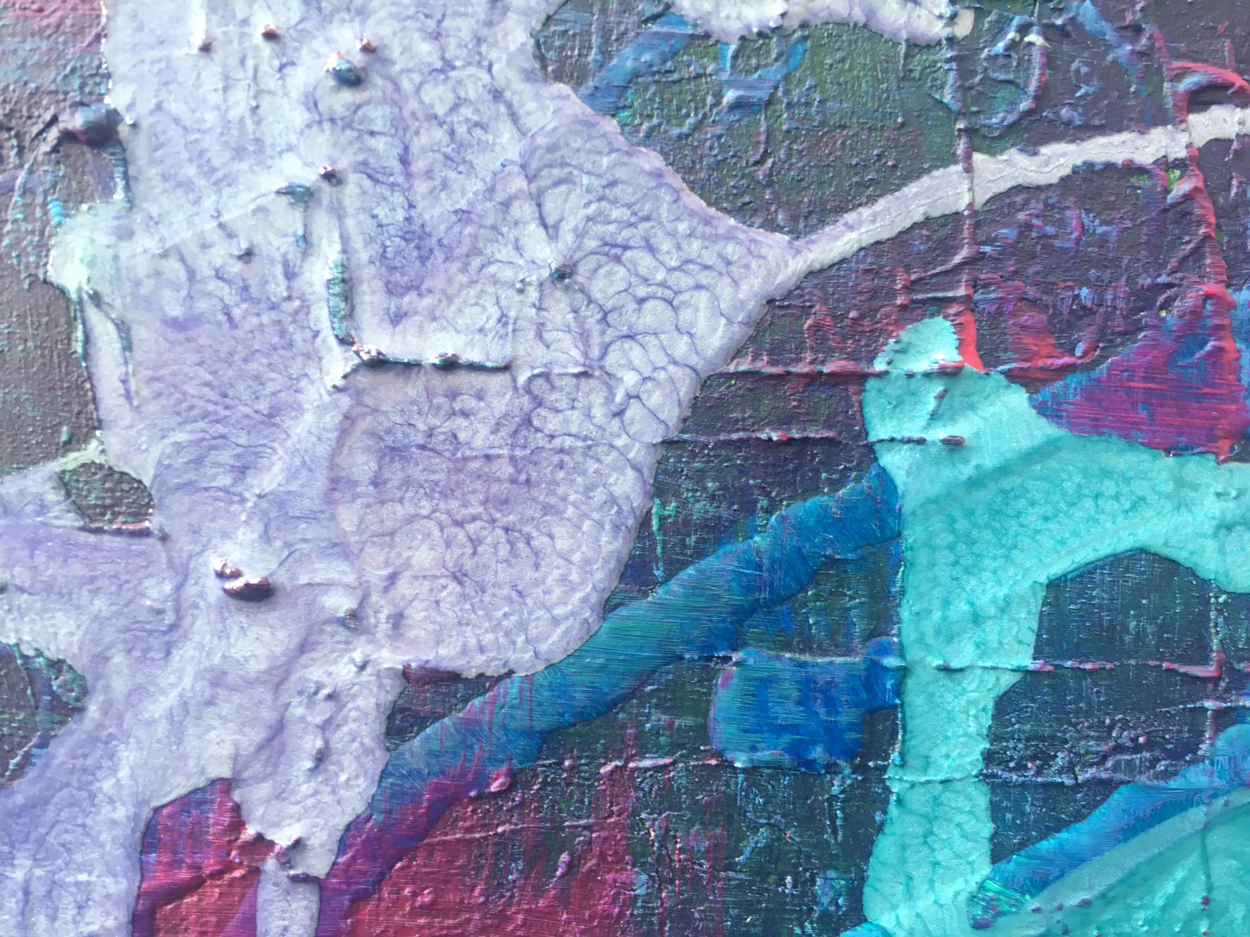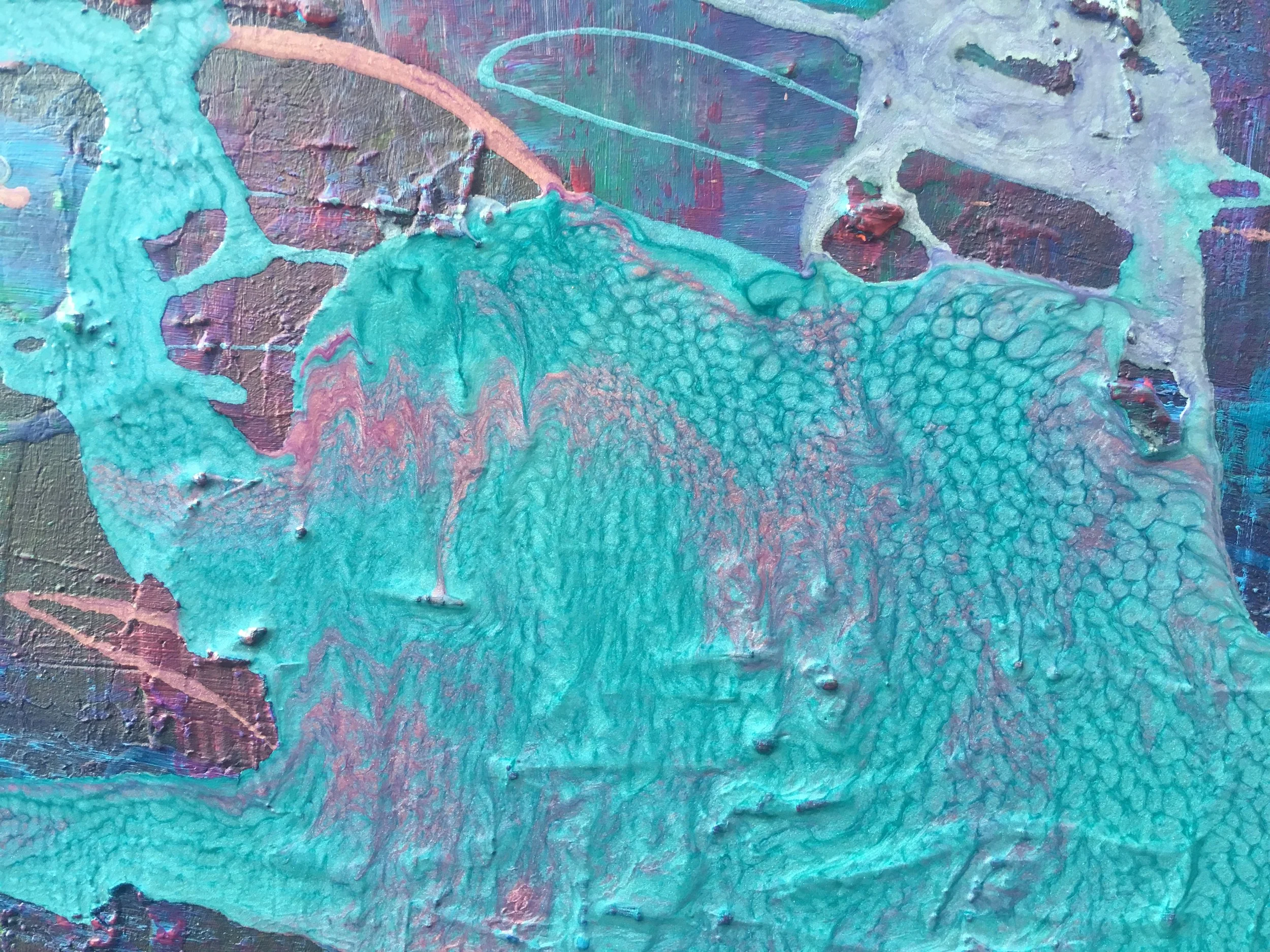 I wanted to create a painting in similar colours to my previous work, Crystal Magic, but on a larger scale and using some of my leftover liquid paints that create a honeycombed and hammered effect.
