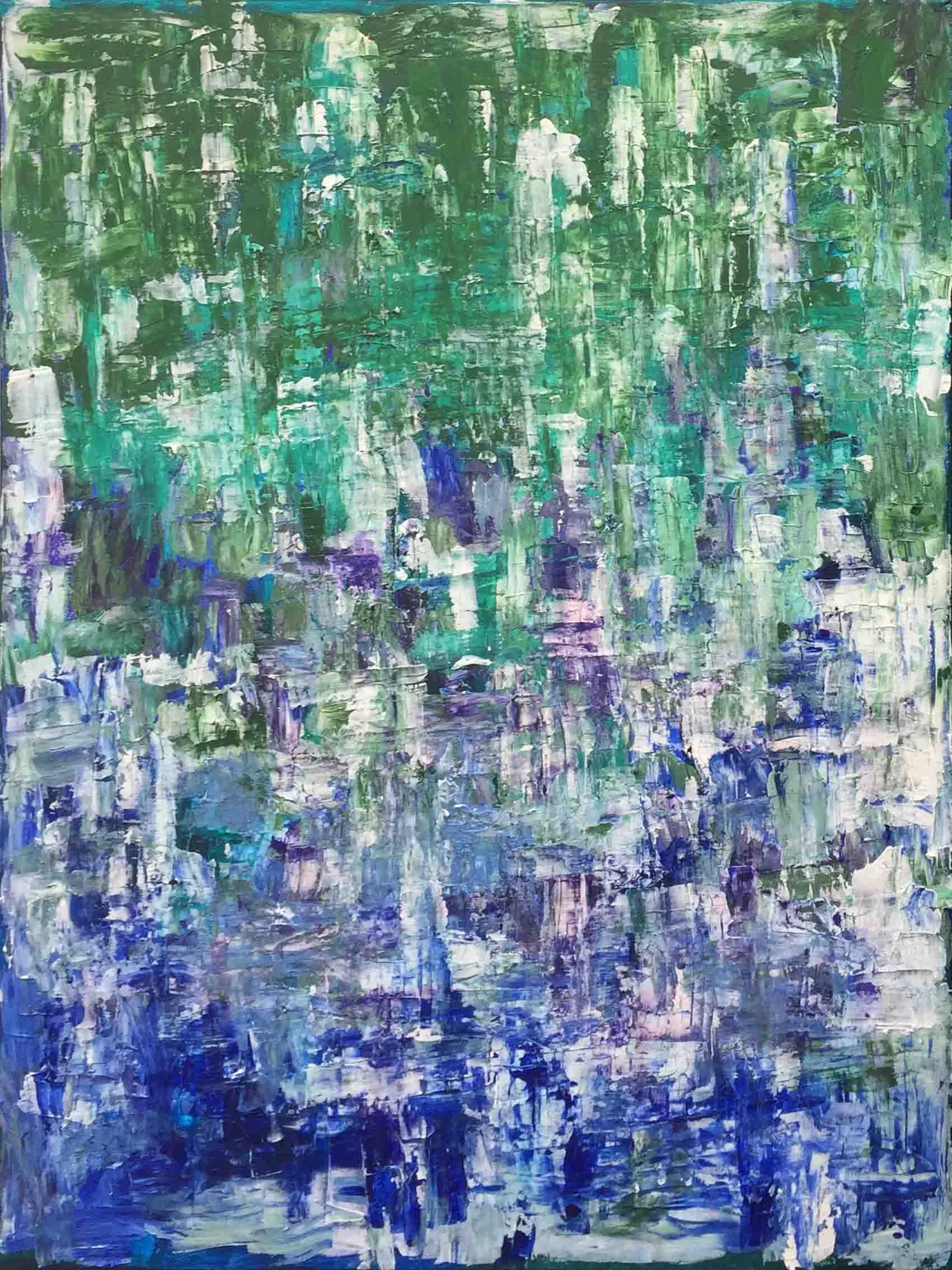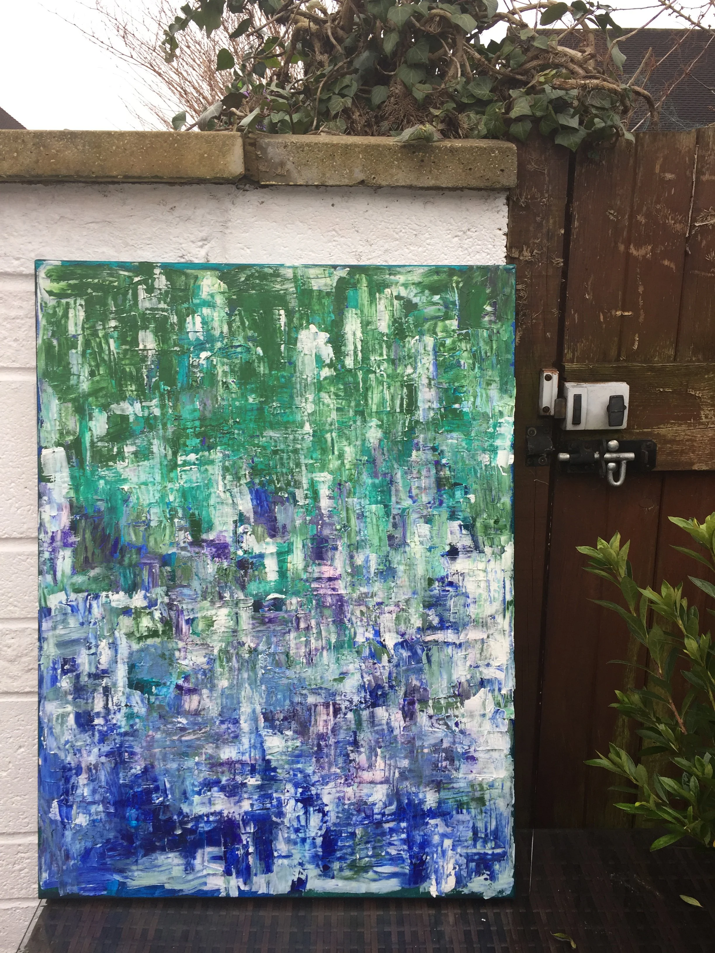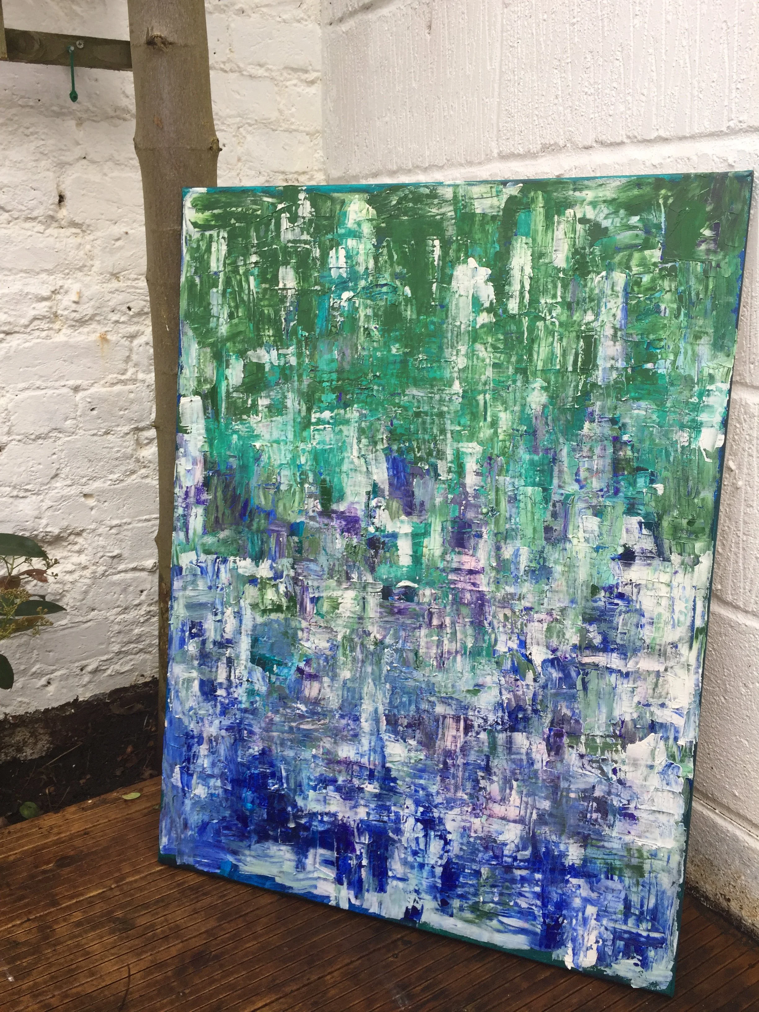 Swamp is a high-textured, colourful abstract composition which is reminiscent of grass and trees over water. I love to use this palette in my work, and Swamp is a perfect example of this combination.
