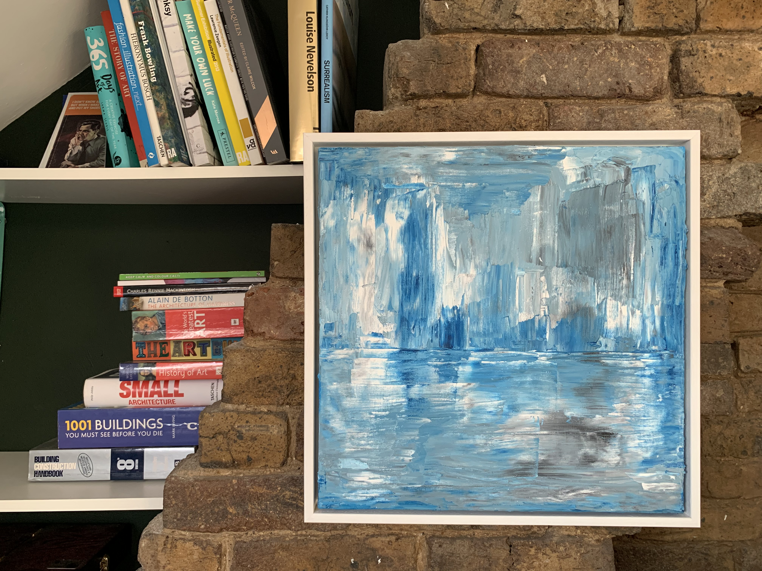 It measures 40cm x 40cm and sits within a white stained oak frame measuring 43.5cm x 43.5cm x 3.5cm with a gap between the canvas and frame to show the painted edges.