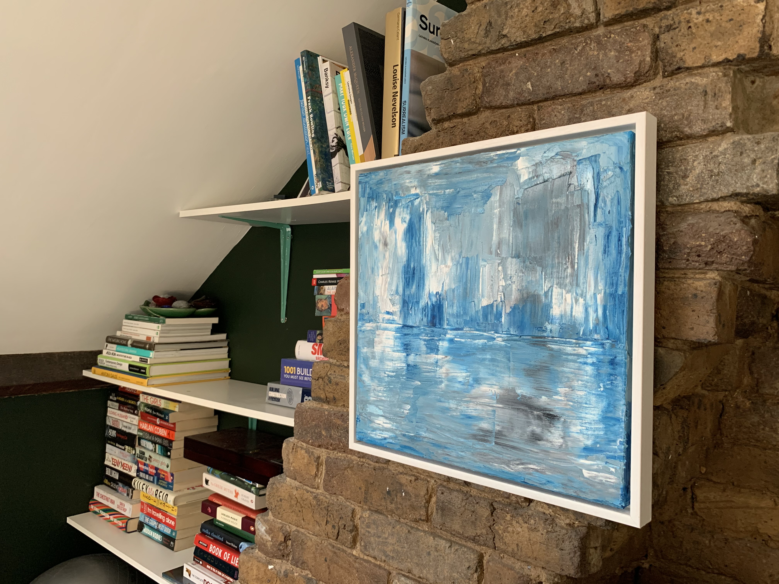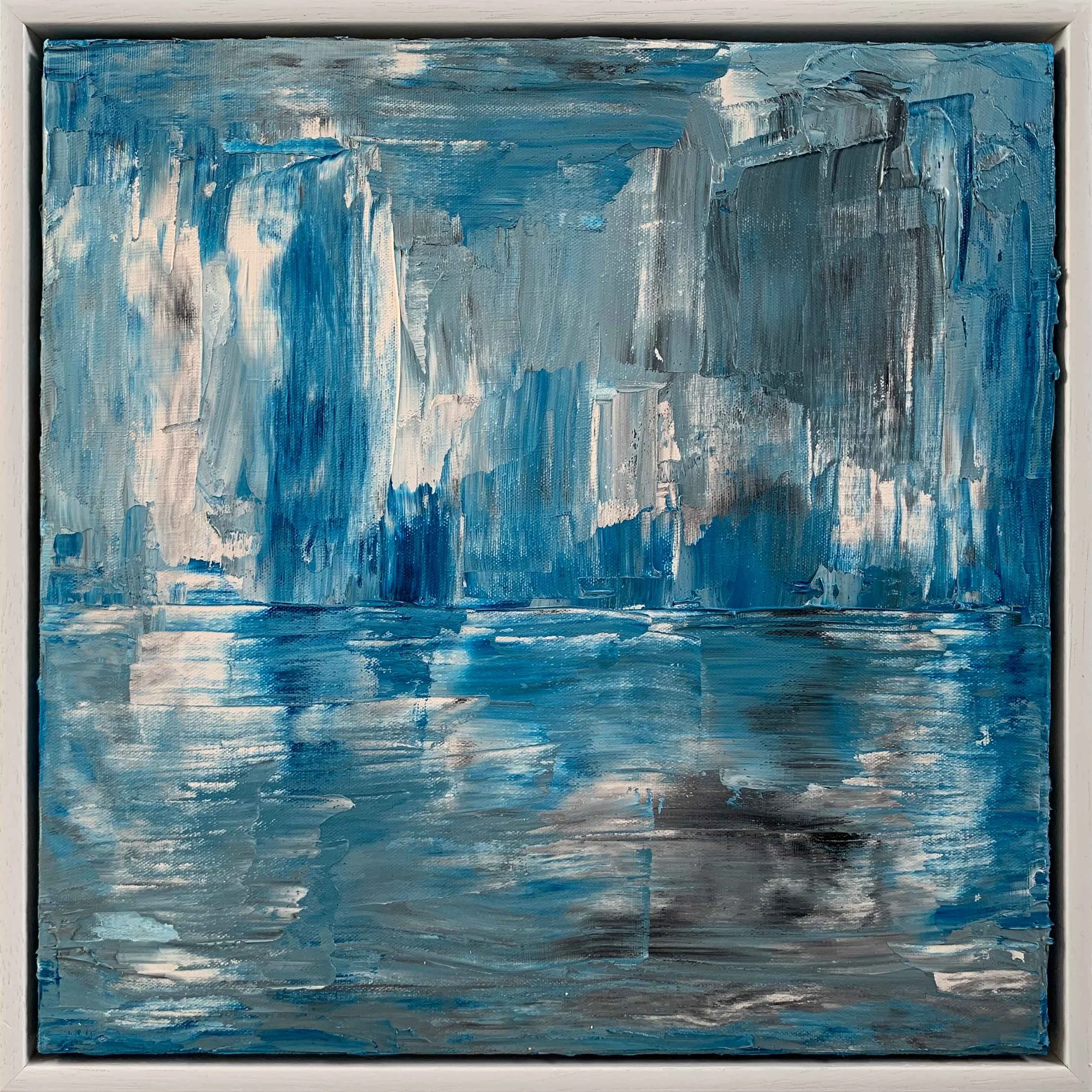 The application of blue white and grey oil paints creates a composition resembling a distant city, standing above choppy water.