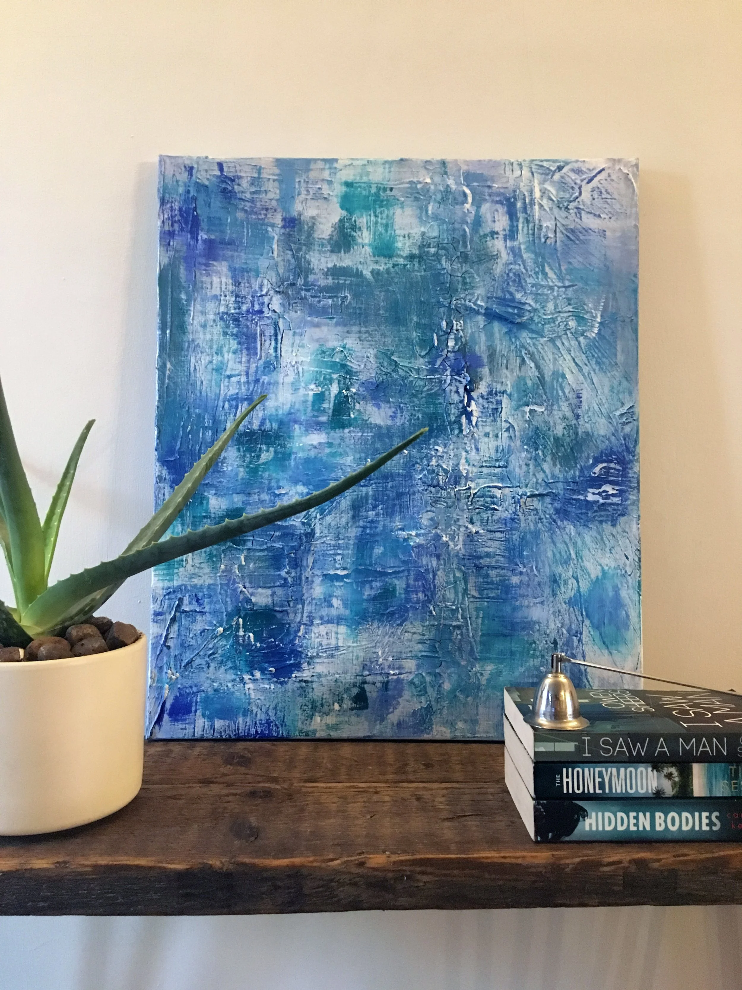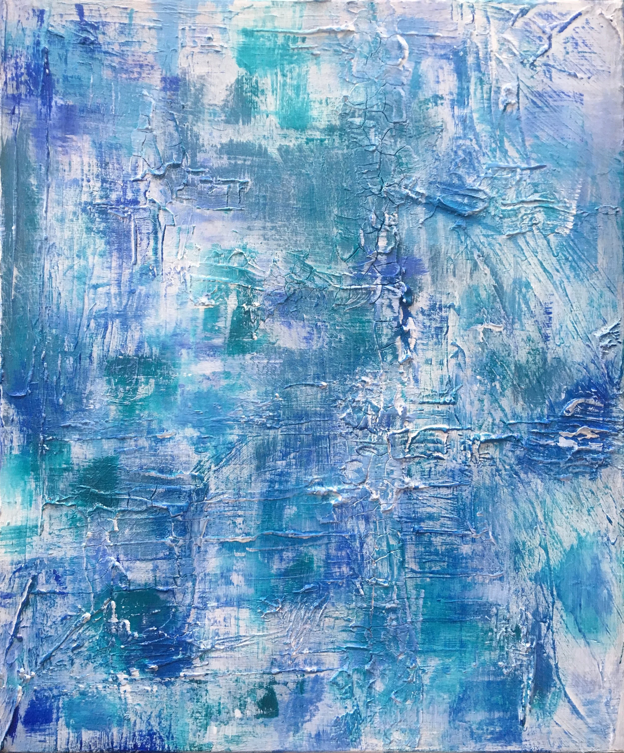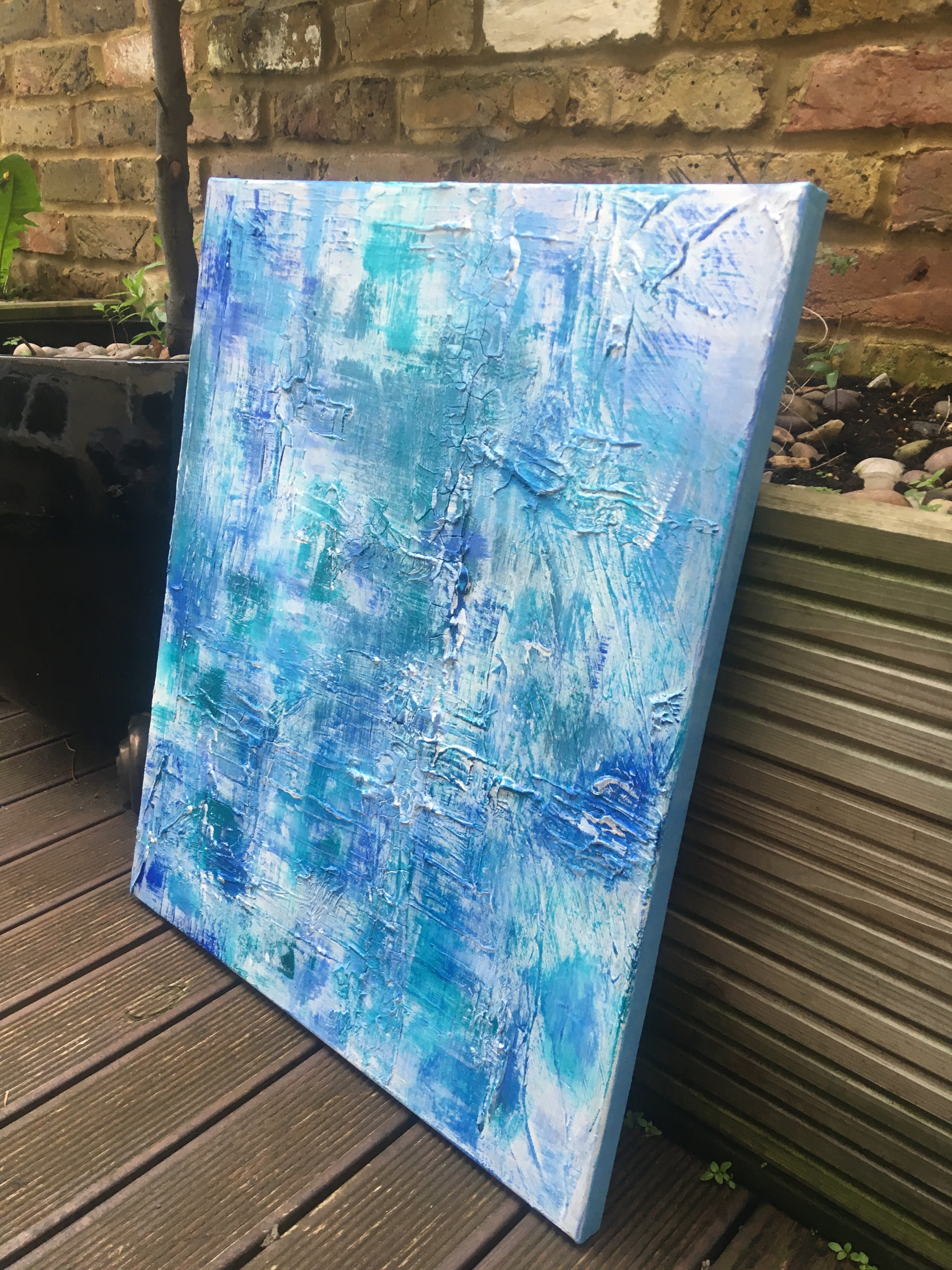 Twisted is an abstract painting using blue, green and white acrylic paints on a 60cm x 50cm canvas.