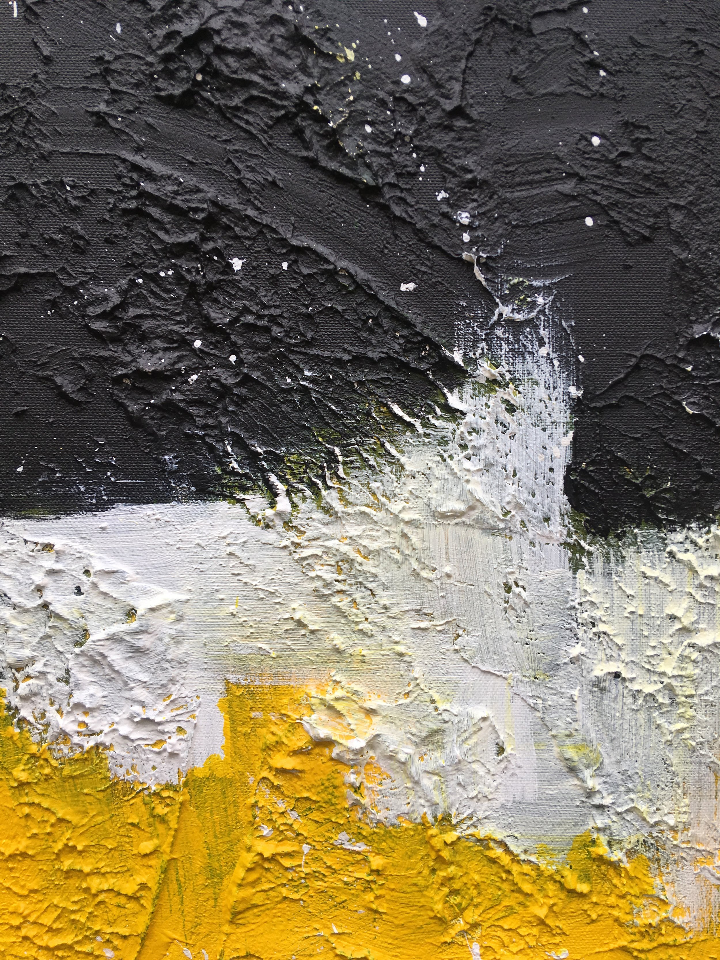 I love the composition of the artwork, how the black half of the canvas balances out the vibrant yellow and the white specks draws them together.