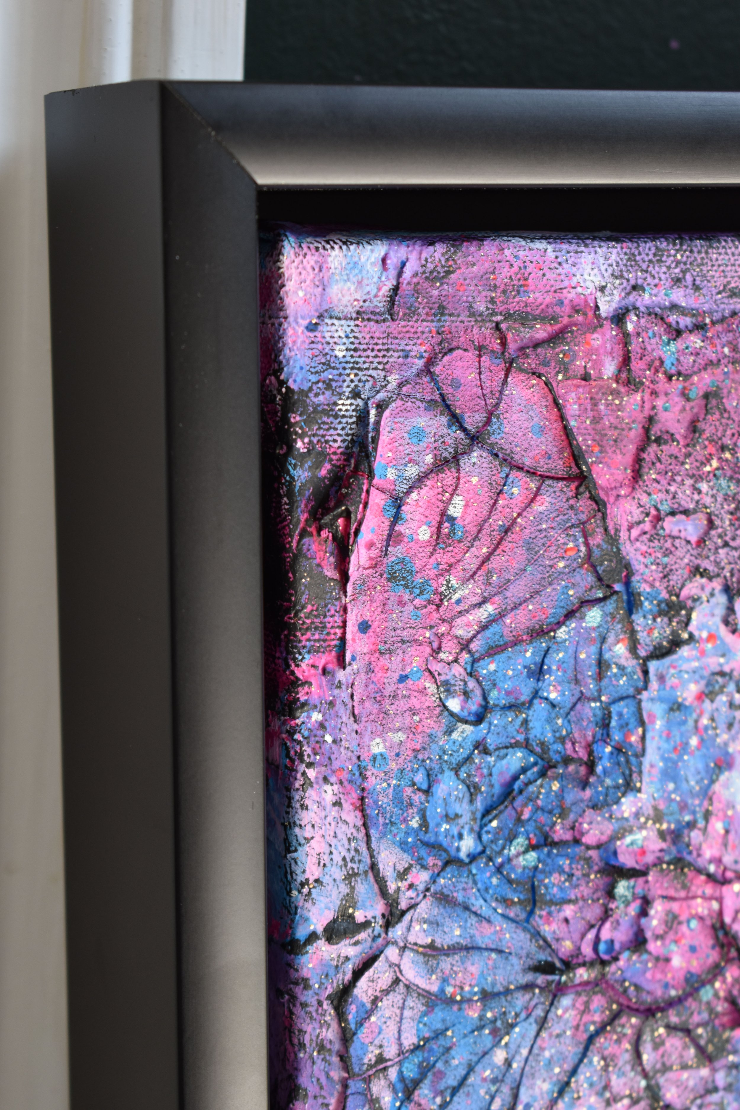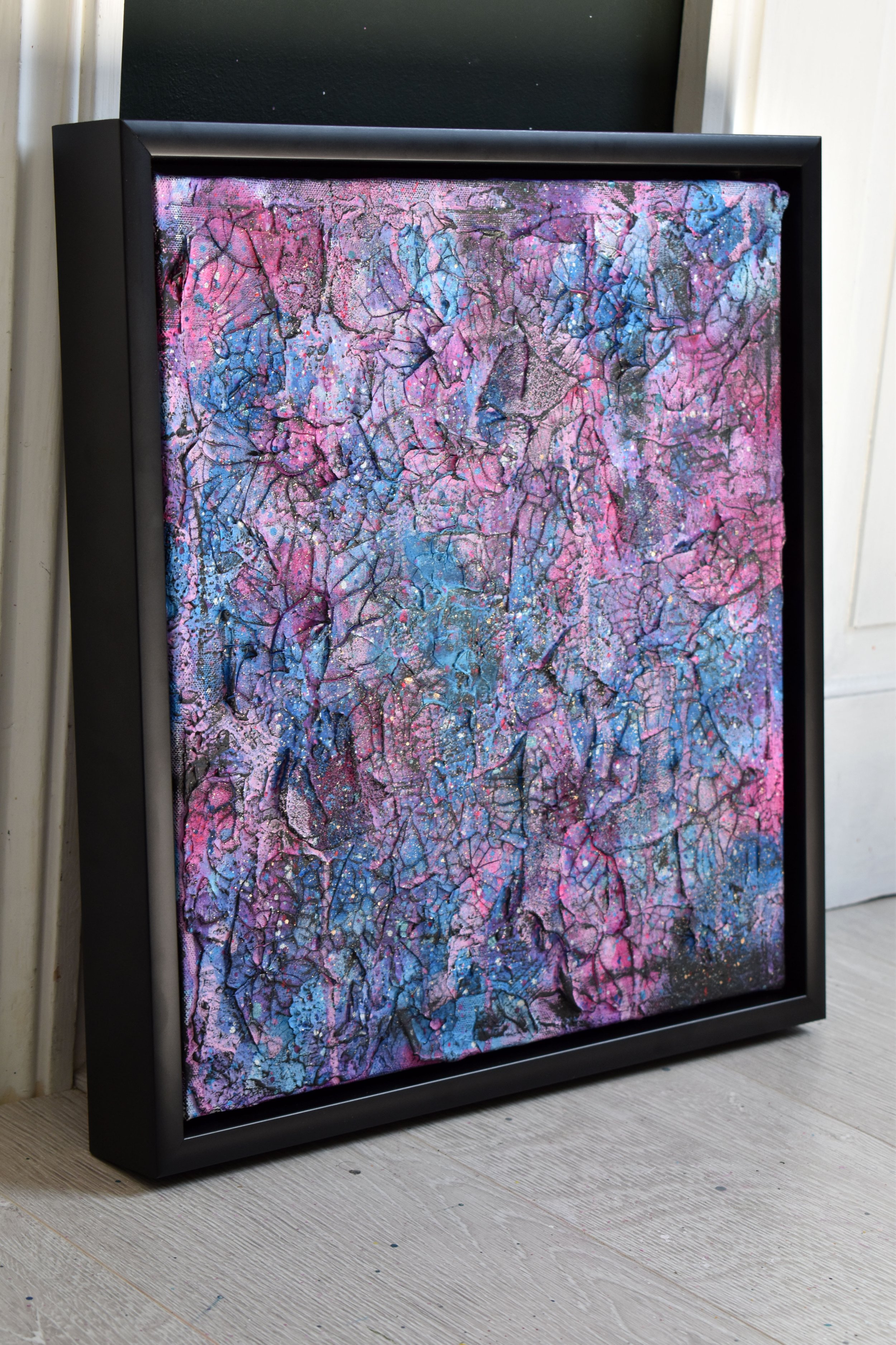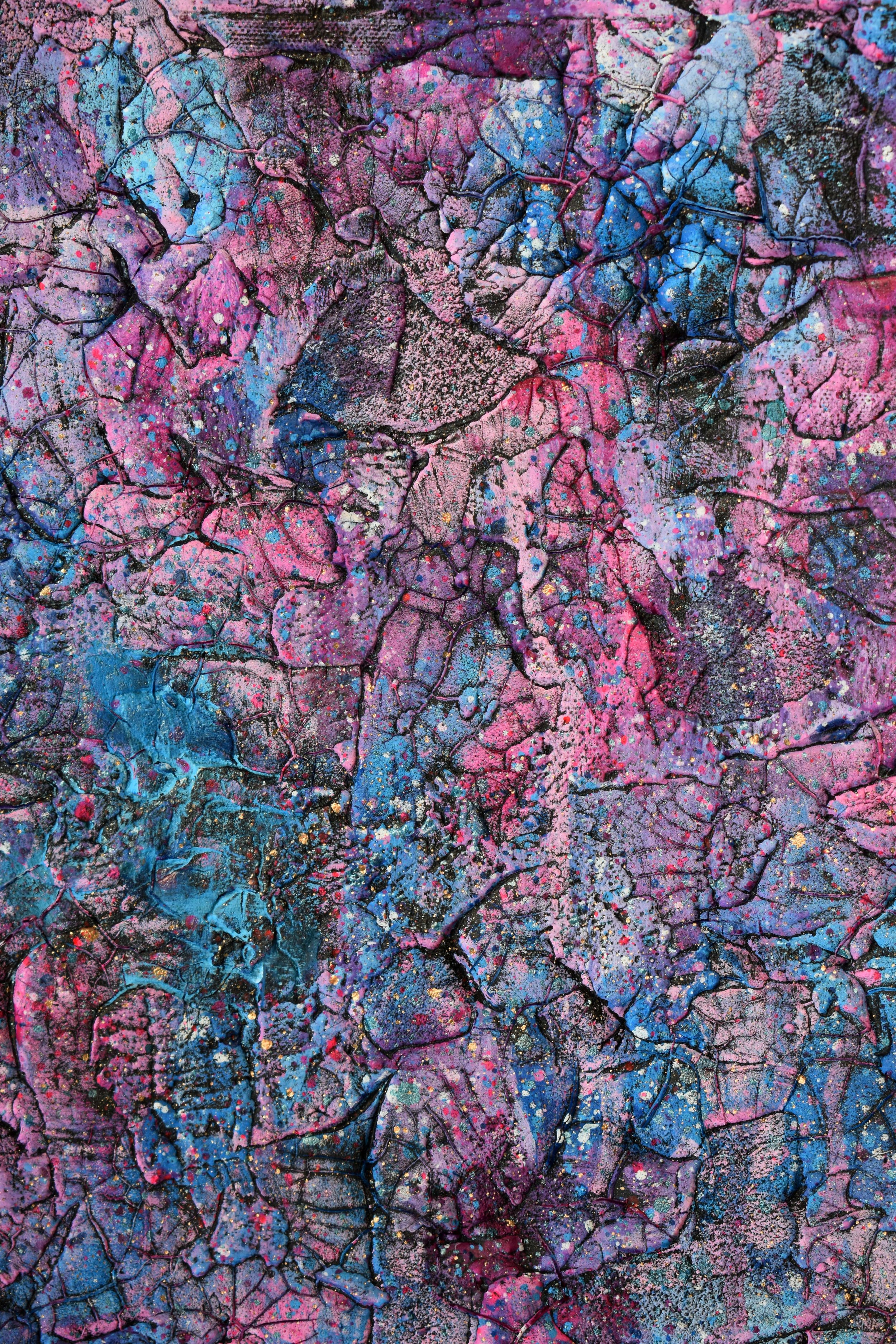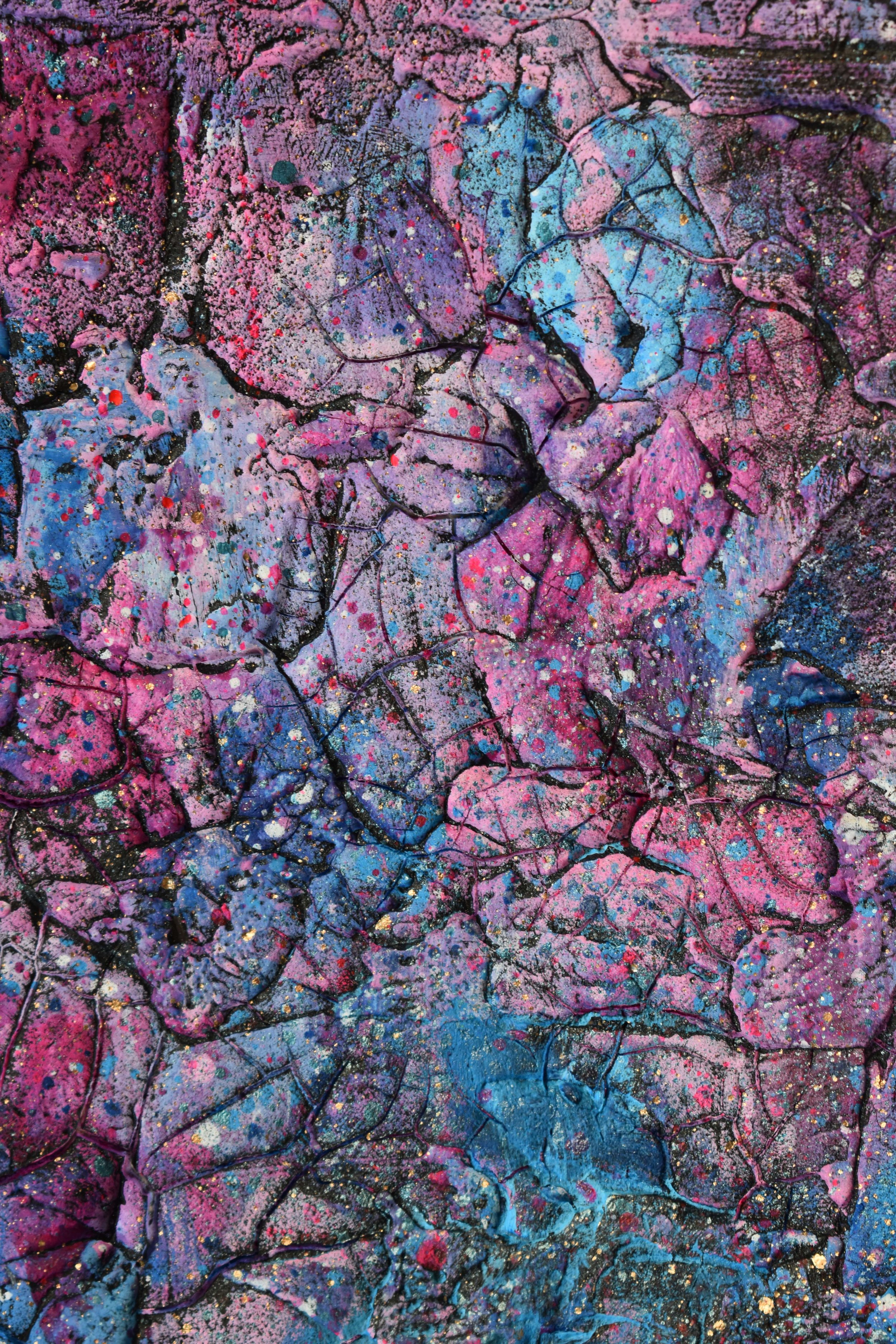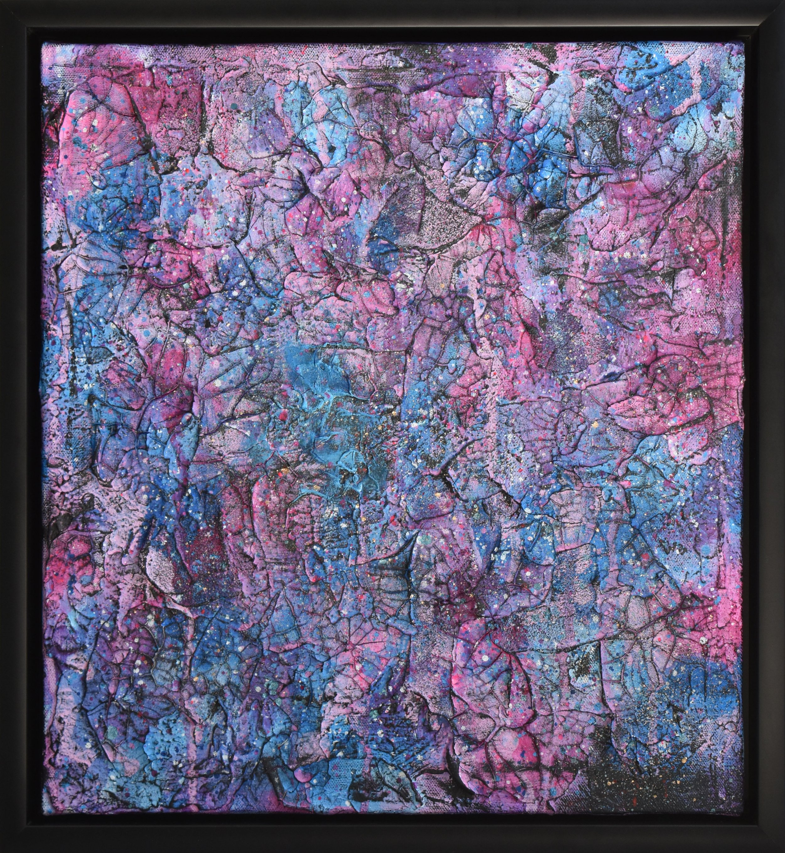 Amethyst, is an original textured abstract painting made with cracking paste, stone paste, acrylic paints and spray paint on canvas.