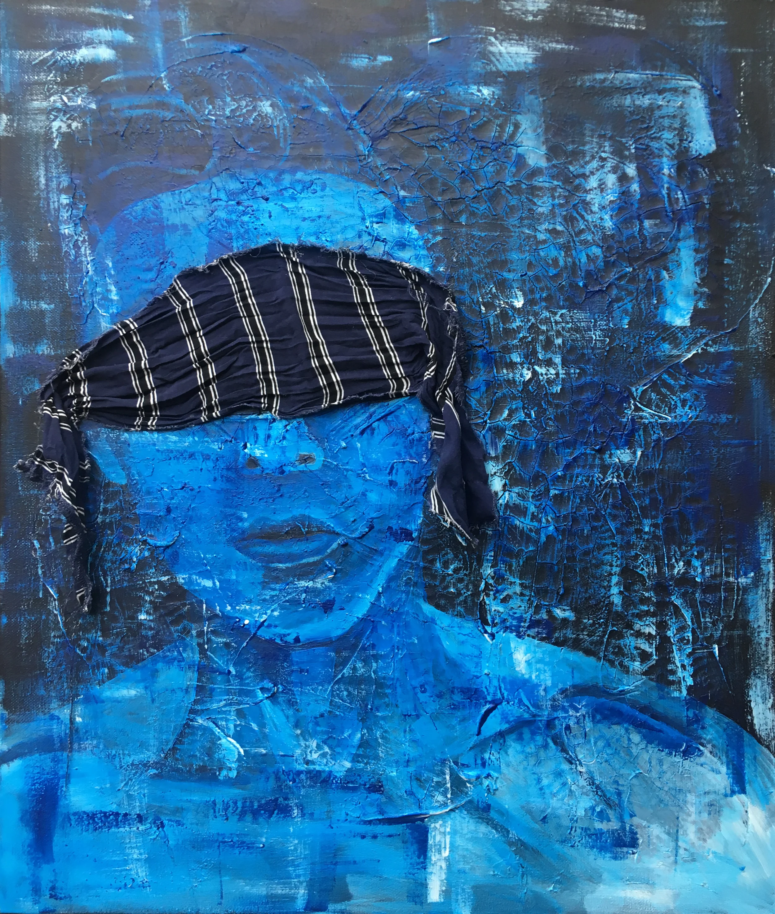 Acrylic paints, cracked clay and fabric are combined on a 60cm x 50cm x 2cm canvas to create this textural, striking and emotive painting that draws your eye from across the room.