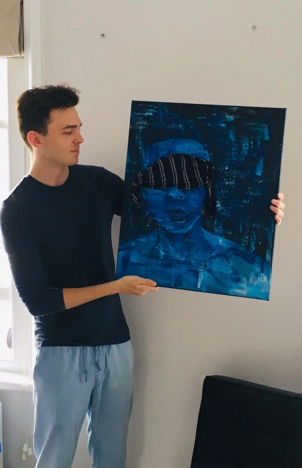 Inspired by a day at Battersea Park in London with my group of gay friends, Picnic is an expressionist view of my day. Masculine blue tones paints a picture of myself, the fabric of one of my friends ripped shirts covering my eyes.