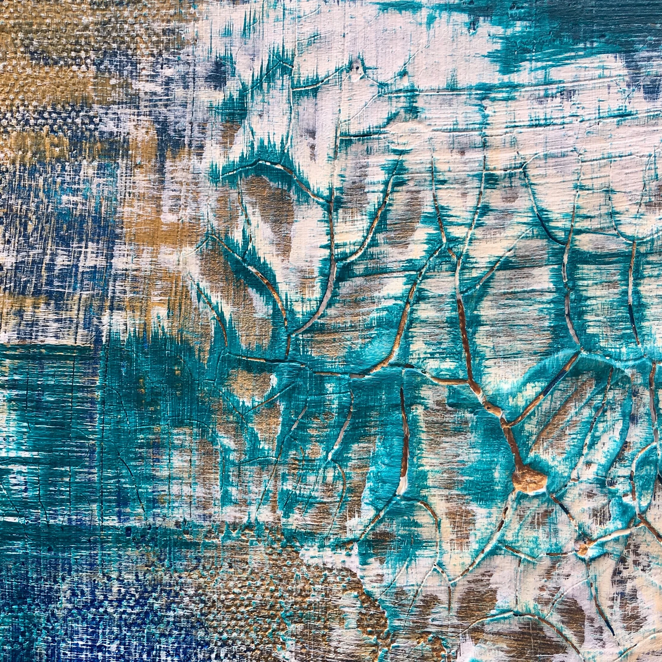 The client requested deeper turquoise and gold colours in the composition as these colours would be used in the newly designed space. I was asked to create one of my colourful compositions instead of a realistic landscape and with only the use of a little textural clay.
