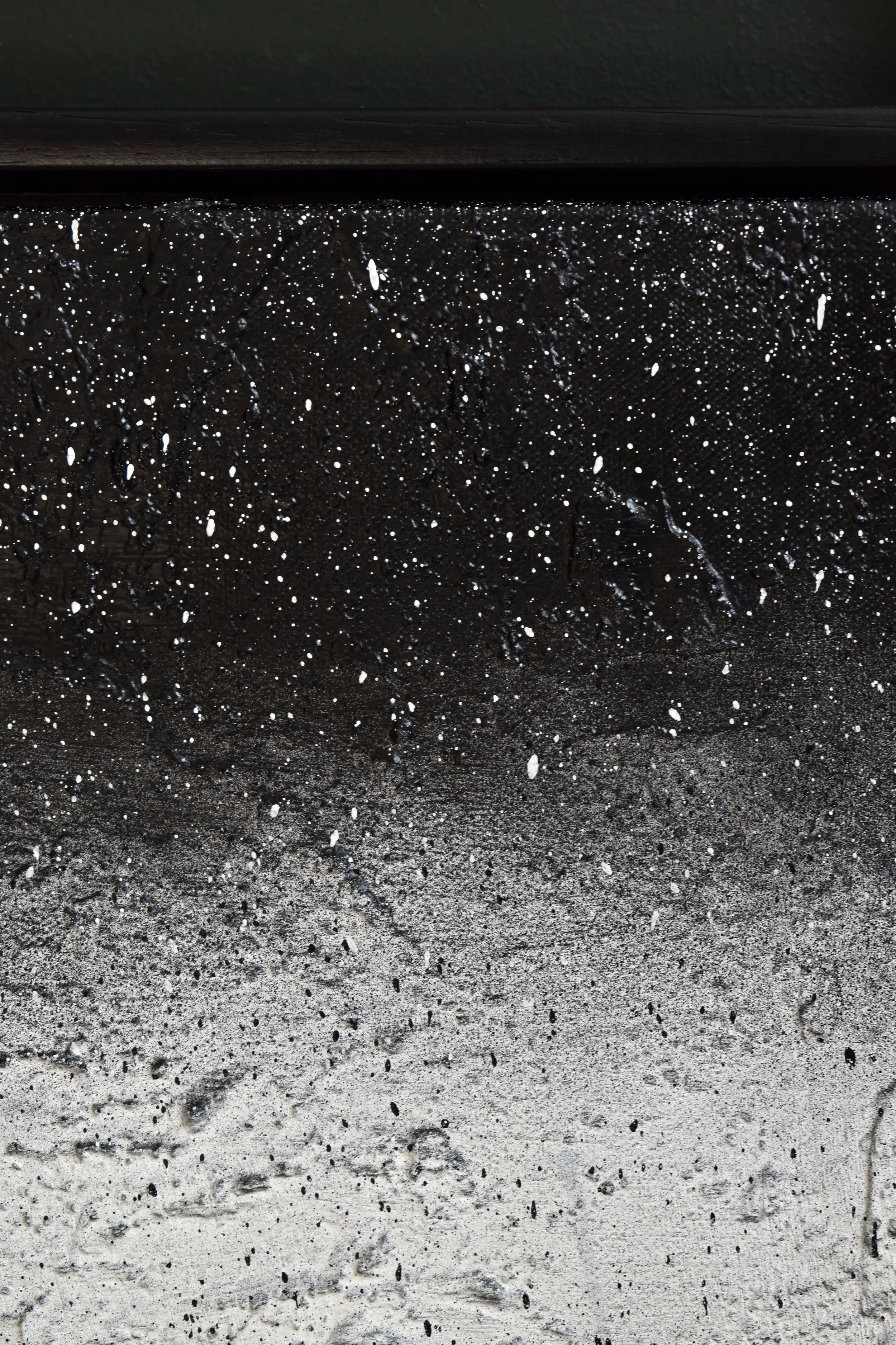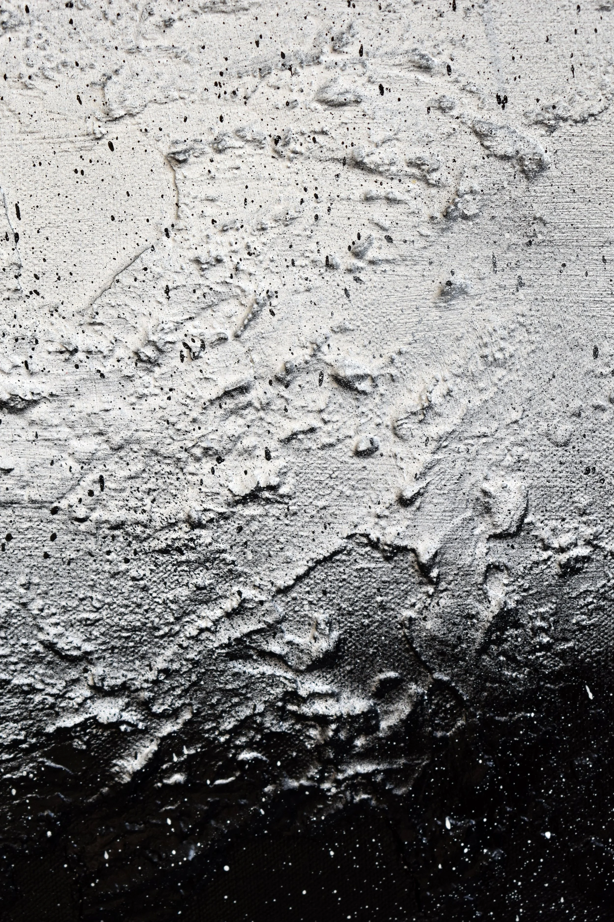 The black and white colour emphasize the rough plastered surface while the flecks of paint adds another beautiful textured element to the composition.