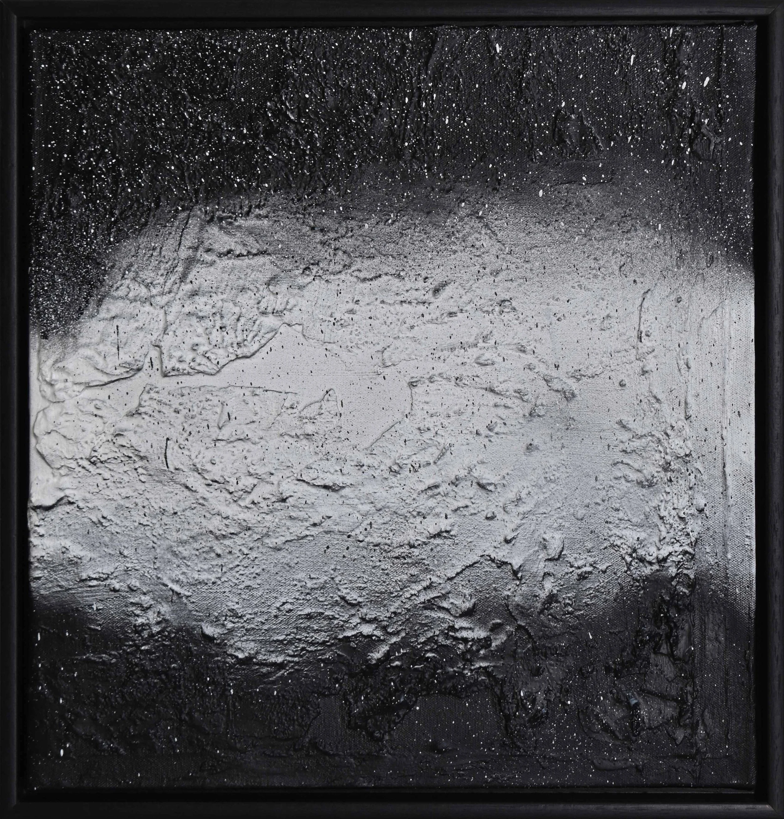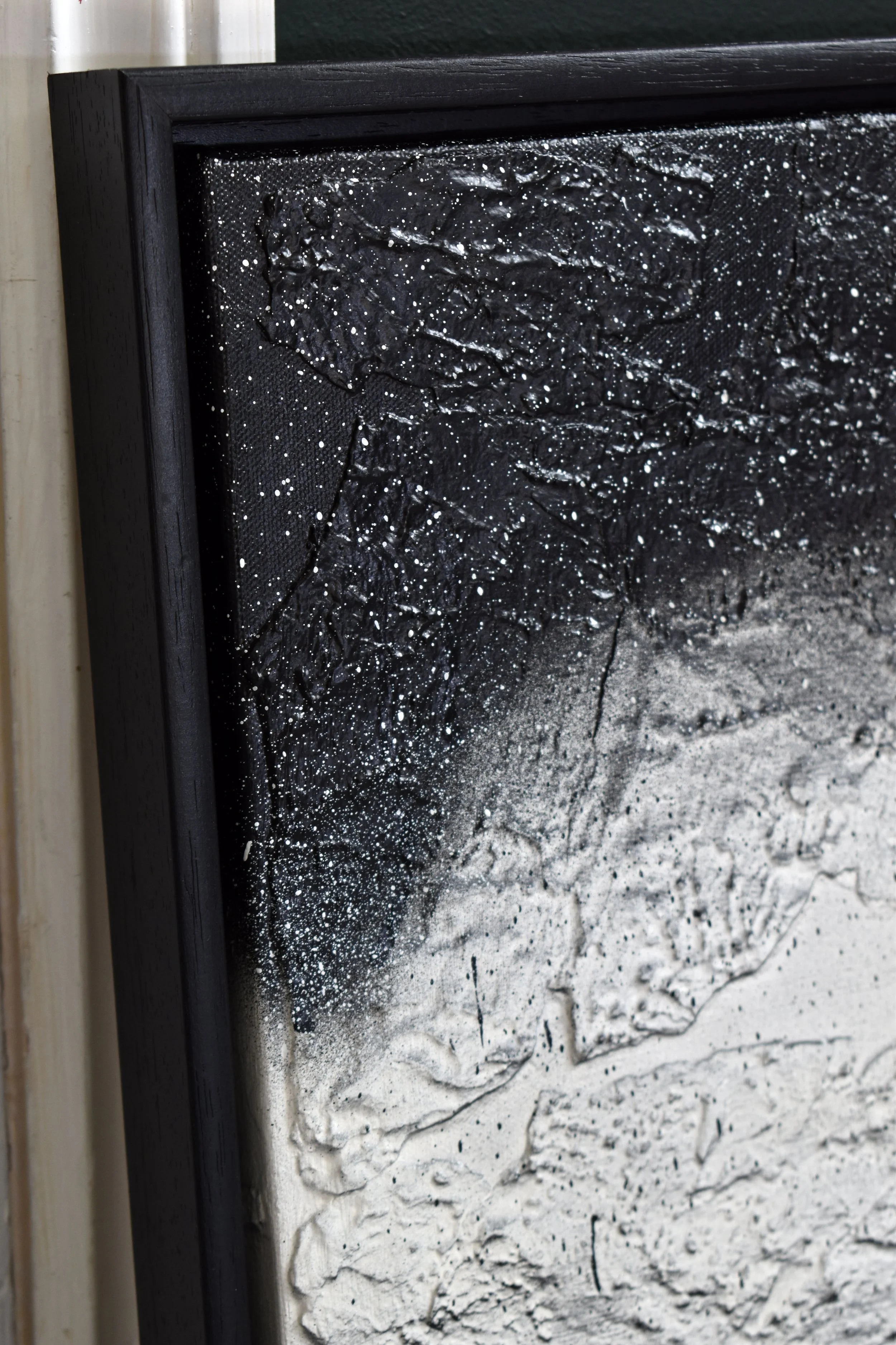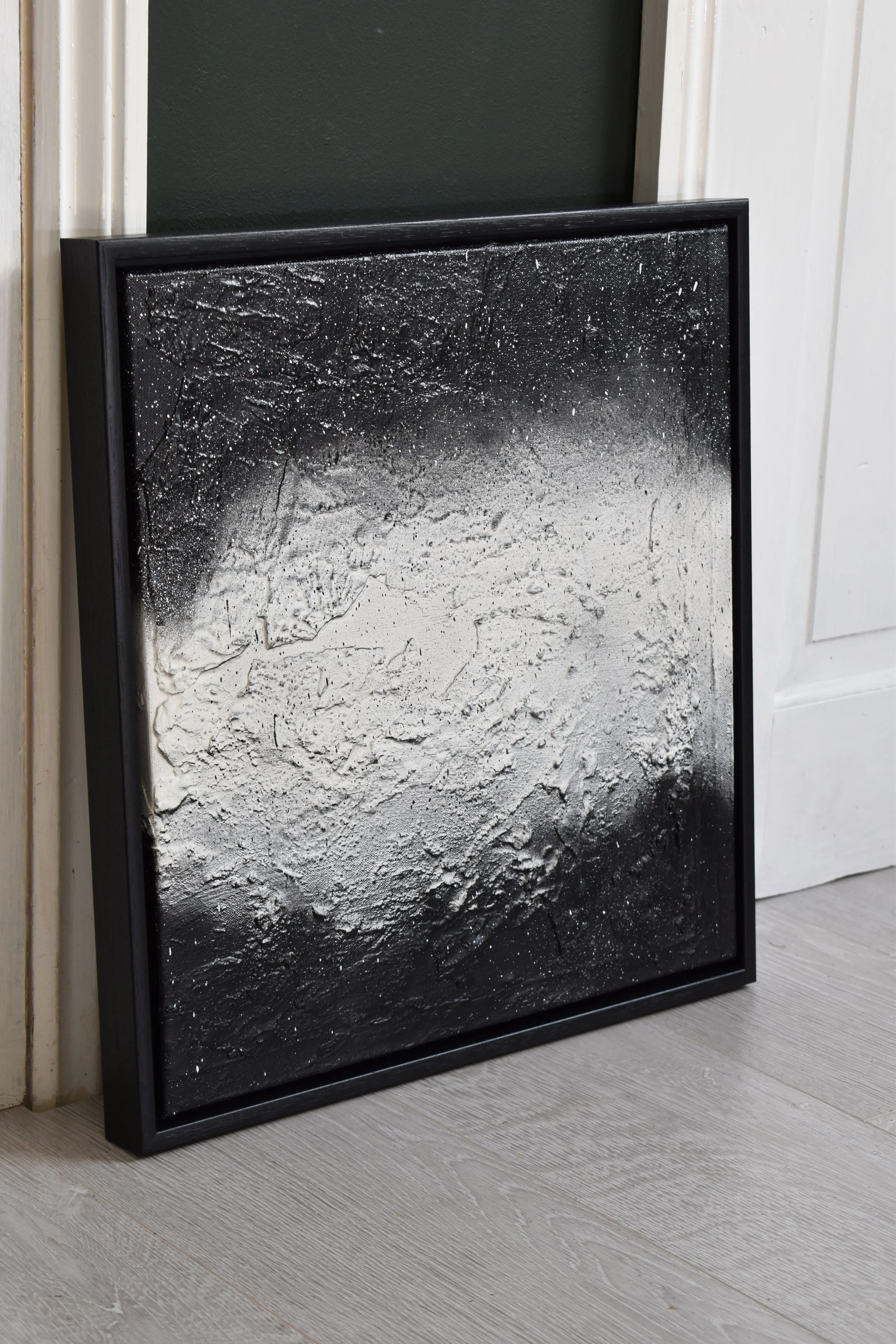 Silence is a 42cm x 40cm abstract painting using black and white spray paint, acrylic paint and plaster on a hand stretched cotton canvas.
