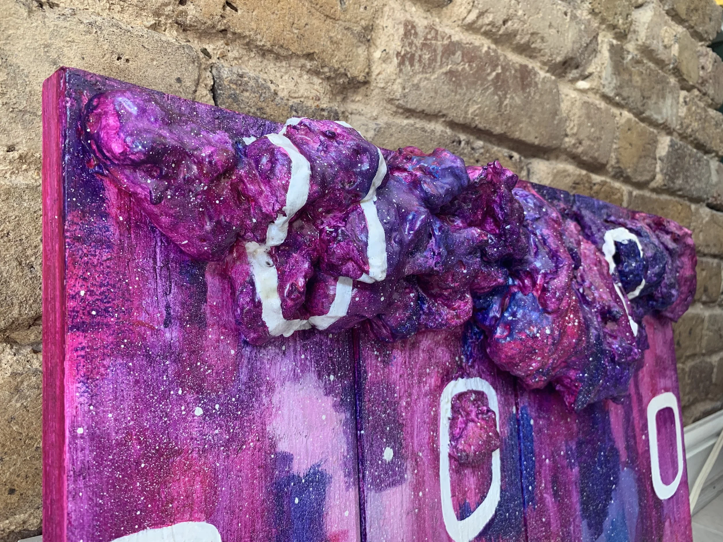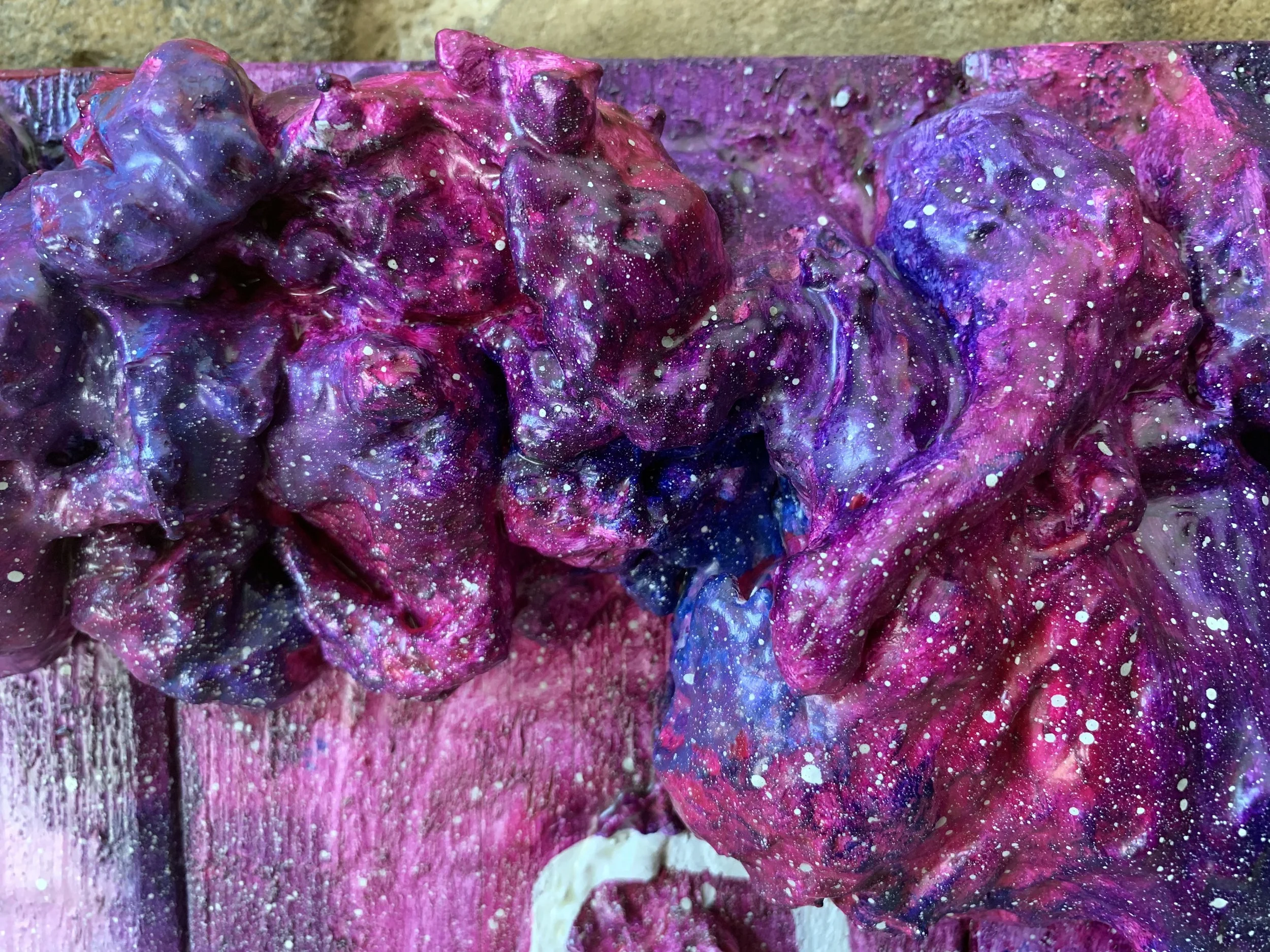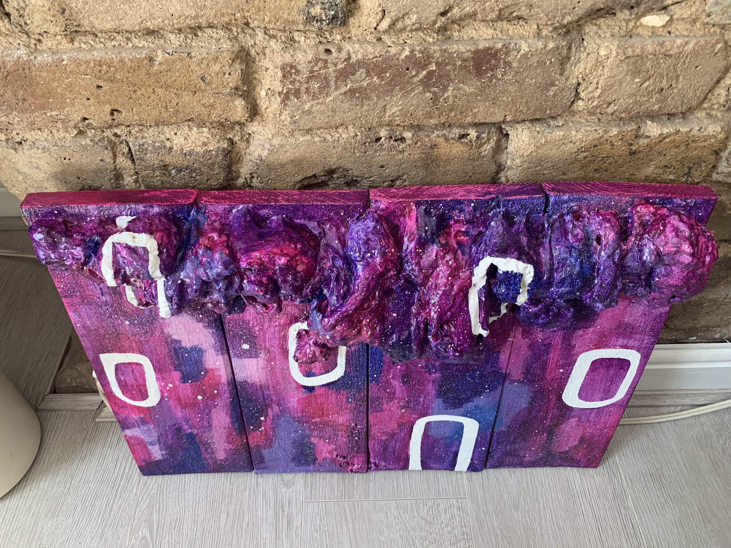 Nebula is a space inspired multimedia abstract artwork created using foam, acrylic paints and spray paint on wood.