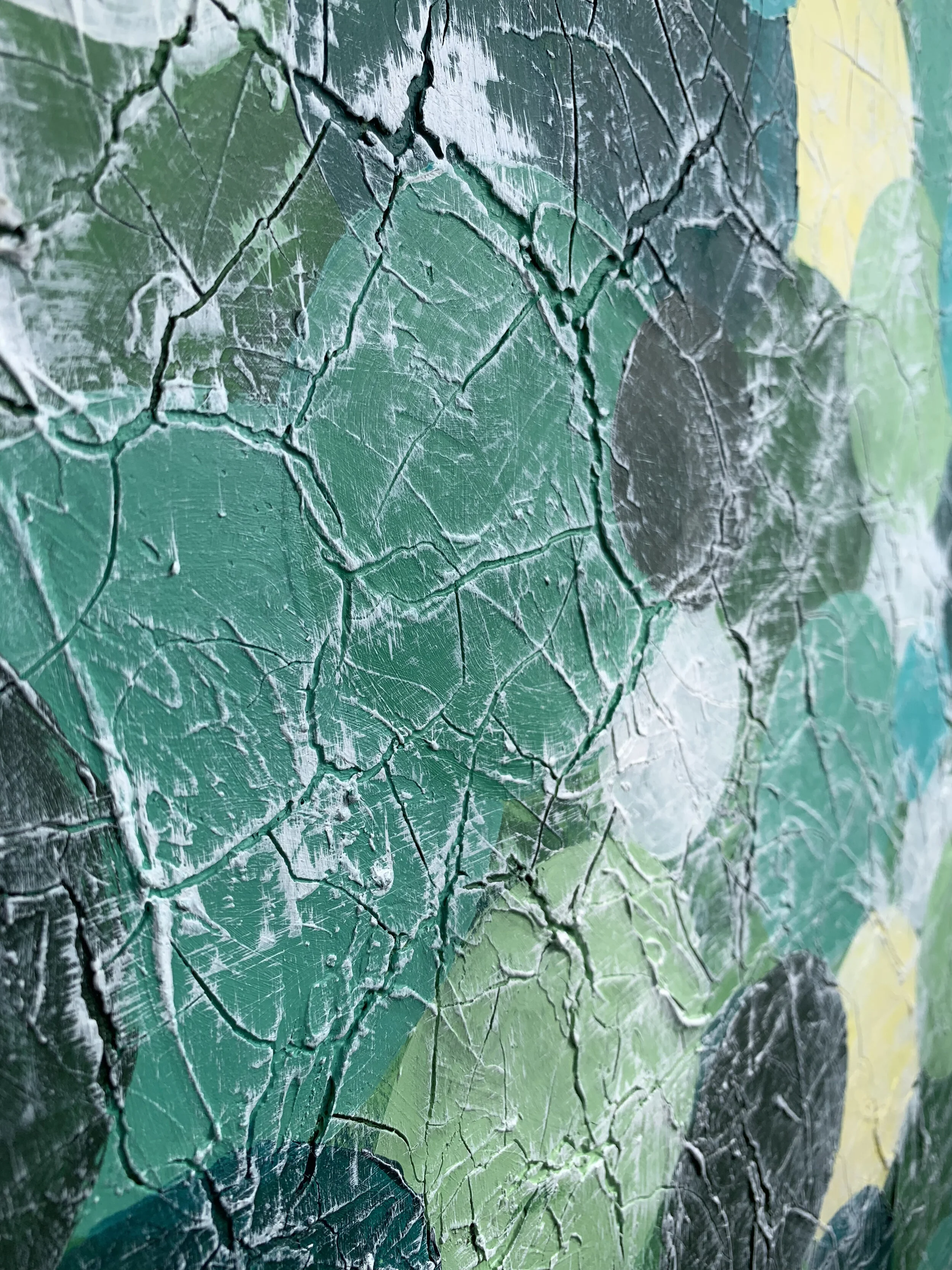 'Spores’ is a 60cm x 60cm abstract composition using blue, green and yellow acrylics over a cracked clay surface.