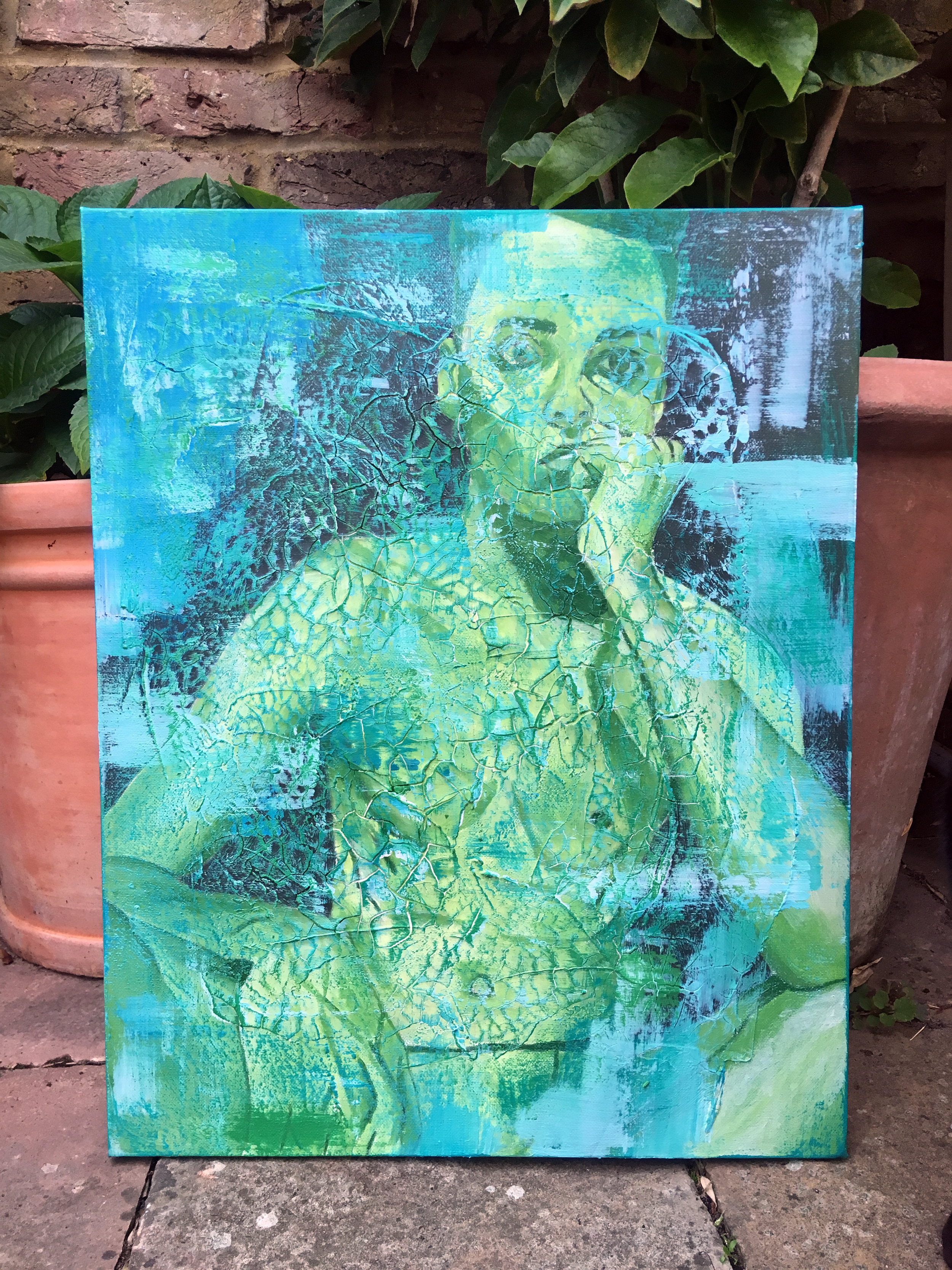 I have used my favourite green and blue colour combination to depict myself and in the brushstrokes that are laid over the figure and the cracked clay surface.