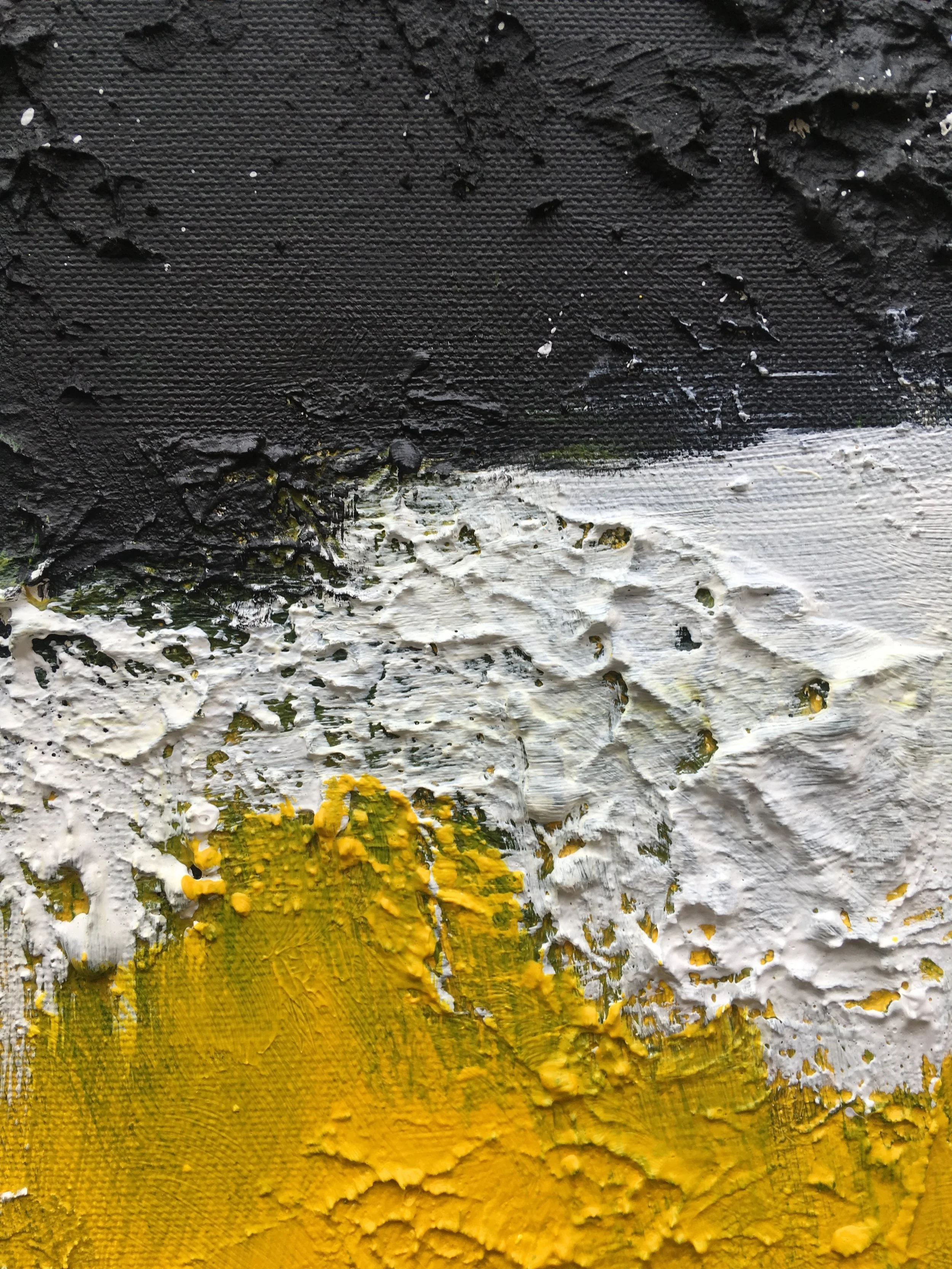 I love the composition of the artwork, how the black half of the canvas balances out the vibrant yellow and the white specks draws them together.